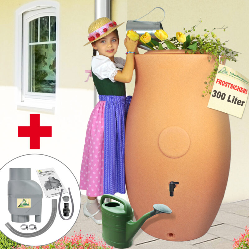 Regenfass mit Pflanzschale – Amphore Maja 300l terrakotta – zzgl. Fallrohrfilter T33 – Auswahl