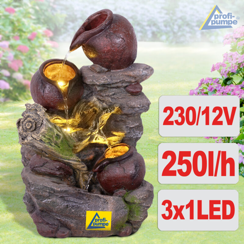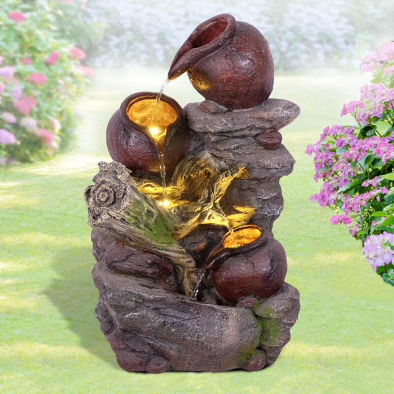 230V – Gartenbrunnen “4-TONKRÜGE IM BAUMFELS” mit LED-Licht