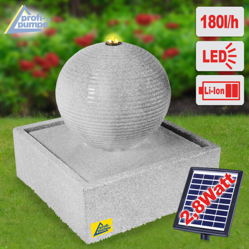 Solar Gartenbrunnen ELEGANTIA Quellkugelbrunnen mit LED-Licht und Li-Ion-Akku
