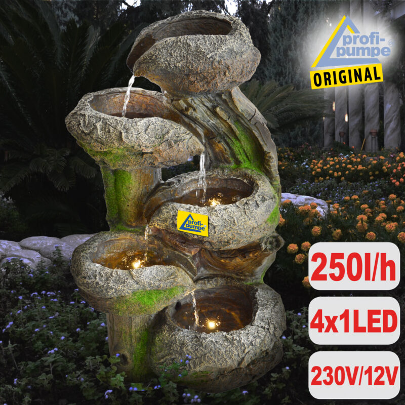 230V – Gartenbrunnen & Wasserspiel “GRANITSCHALEN-KASKADE-4” mit LED-Licht