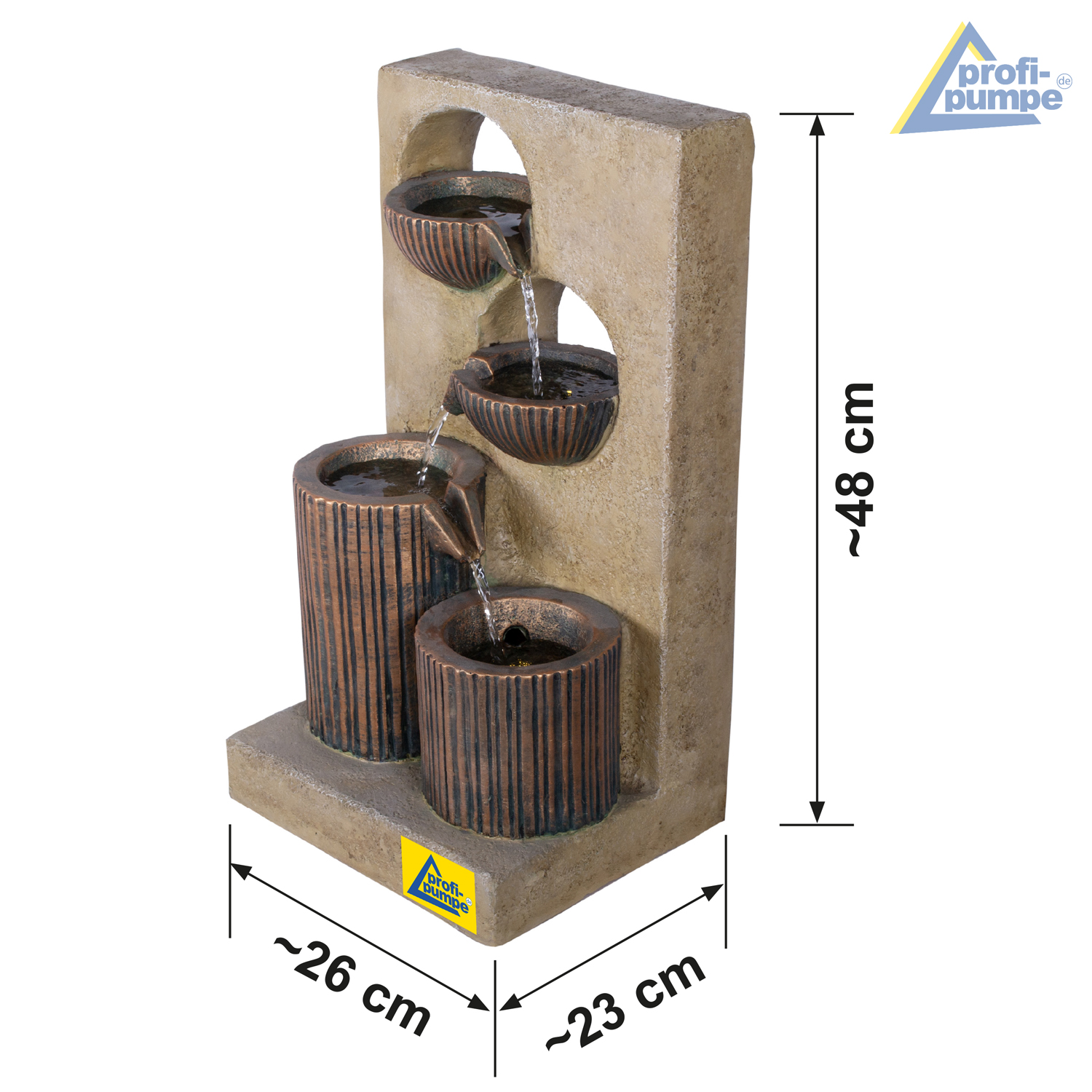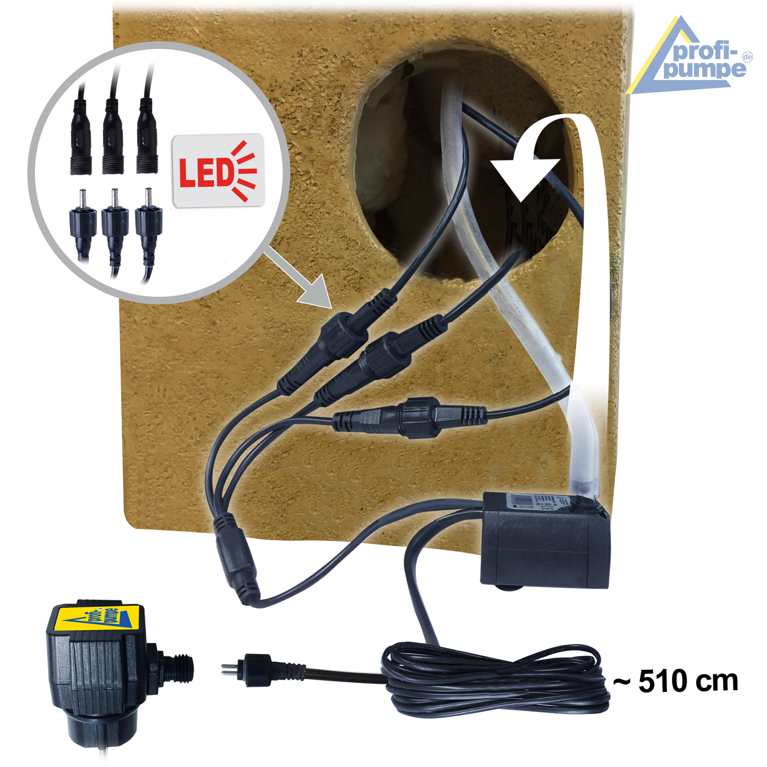 Der Wasserbrunnen ist für den 230-Volt-Betrieb vorgesehen. Die Pumpe und die LEDs werden mit sicherer 12V-Niederspannung betrieben (Adapter im Lieferumfang enthalten). Alle Kabelverbindungen sind verpolungssicher, wasserdicht und absolut funktionssicher. Dank praktischer Steckverbindungen sind alle Komponenten jederzeit austauschbar. So können Sie den Wasserbrunnen mit der effektvollen LED-Beleuchtung und das fließende Wasser jahrelang genießen!
