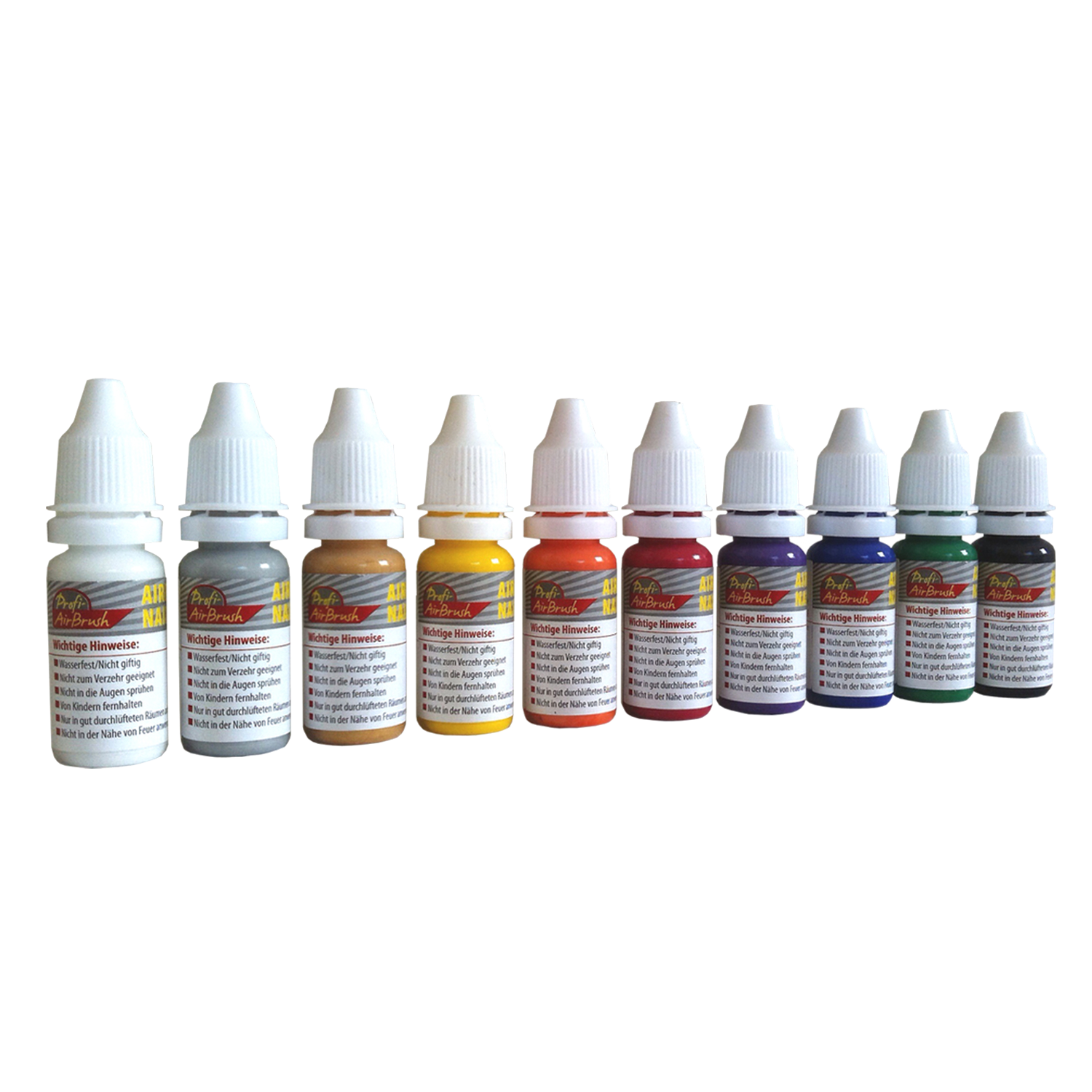 Das auf Wasser/ Acryl basierende Airbrush-Naildesign Farben-Set enthält 10 Fläschchen mit je 10ml Airbrush-Nagel-Farben in den Farben white, mid yellow, pearly orange, mid green, red, purple, ultramarine, black, pearly silver gray und pearly golden.