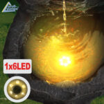 Mit der Stein-Dekoration sorgt der Gartenbrunnen für eine naturnahe Atmosphäre und Entspannung. Der Gartenbrunnen ist sowohl bei Tag als auch bei Nacht der perfekte Hingucker. Die mitgelieferte LED-Beleuchtung sorgt für die perfekte Illumination. Die LED-Lichter des austauschbaren LED-Rings erstrahlen in einem warmen Weiß. Ganz gleich, wo der In- und Outdoor-Brunnen aufgestellt wird – der wassersprudelnde Gartenbrunnen wertet jeden Standort auf. Das Lebensexlixier Wasser belebt Wohnzimmer, Esszimmer, Flure und Eingangsbereiche, Wintergärten oder Balkone, Terrassen und Gärten im privaten wie gewerblichen Umfeld.