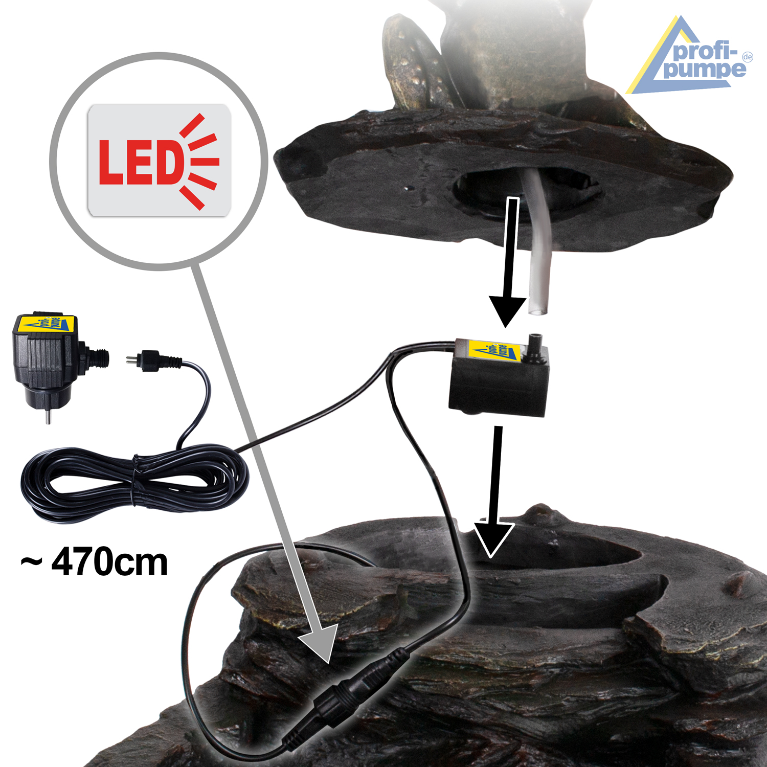 Der wirkungsvolle Zierbrunnen ist für den 230-Volt-Betrieb vorgesehen. Die Pumpe und die LEDs werden mit sicherer 12V-Niederspannung betrieben (Adapter im Lieferumfang enthalten). Alle Kabelverbindungen sind verpolungssicher, wasserdicht und absolut funktionssicher. Dank praktischer Steckverbindungen sind alle Komponenten jederzeit austauschbar. So können Sie den Brunnen und das fließende Wasser jahrelang genießen!