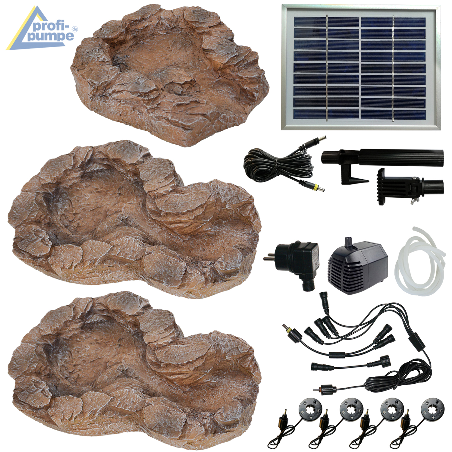 Bachlauf QUELLBACH II in sand-stein Zwei große Erweiterungs-Schalen und eine Schale mit Pumpenanschluss (oberste Schale) mit 4 RGB LED-Licht und…