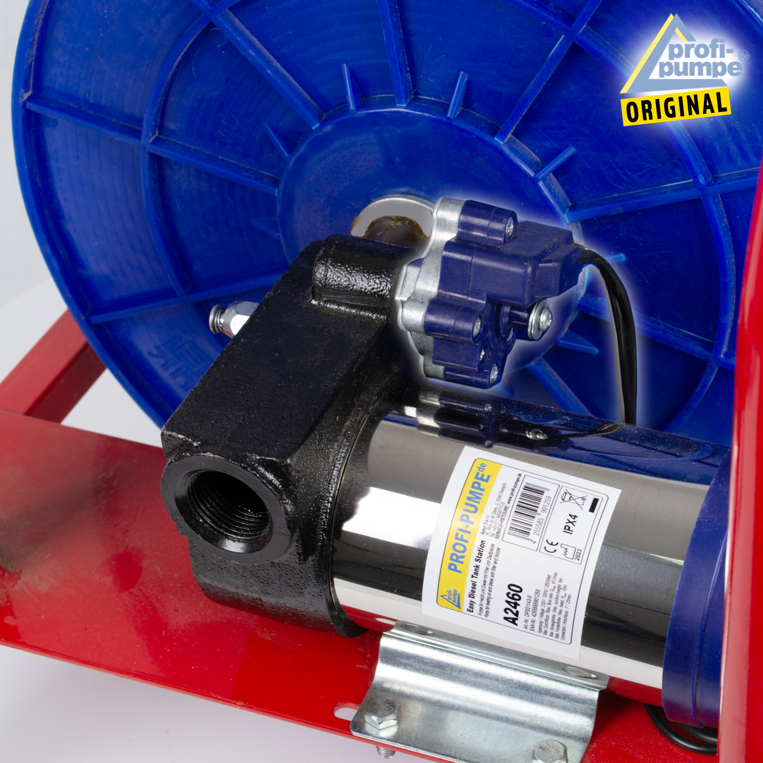 EASY Diesel Tank Station – elektrische 230-Volt Diesel-Pumpe mit Druckschlauch-Trommel, Automatik-Zapf-Pistole und Rückschlagventil mit Vorfilter. Die saugstarke Diesel-Tank-Station kann einfach und überall mobil eingesetzt werden. So macht das Umtanken Spaß und bleibt eine saubere Sache! Die Pumpe ist betriebsfertig mit der Schlauchtrommel verbunden. Der Filterkorb, der Vorfilter und die Zapfpistole werden mit dem mitgelieferten Zubehör sicher miteinander angeschlossen, so dass eine komplette Diesel-Zapfstelle entsteht.