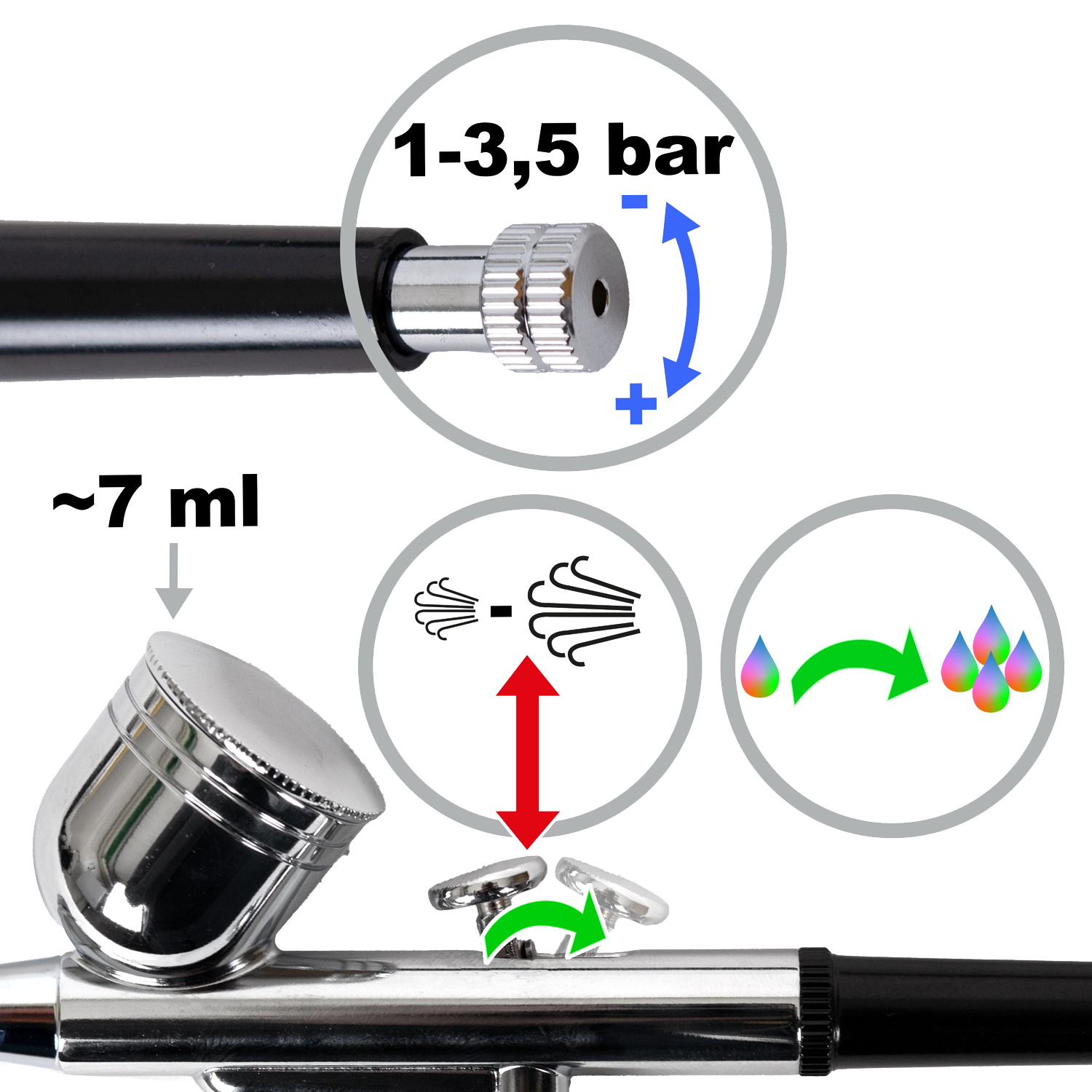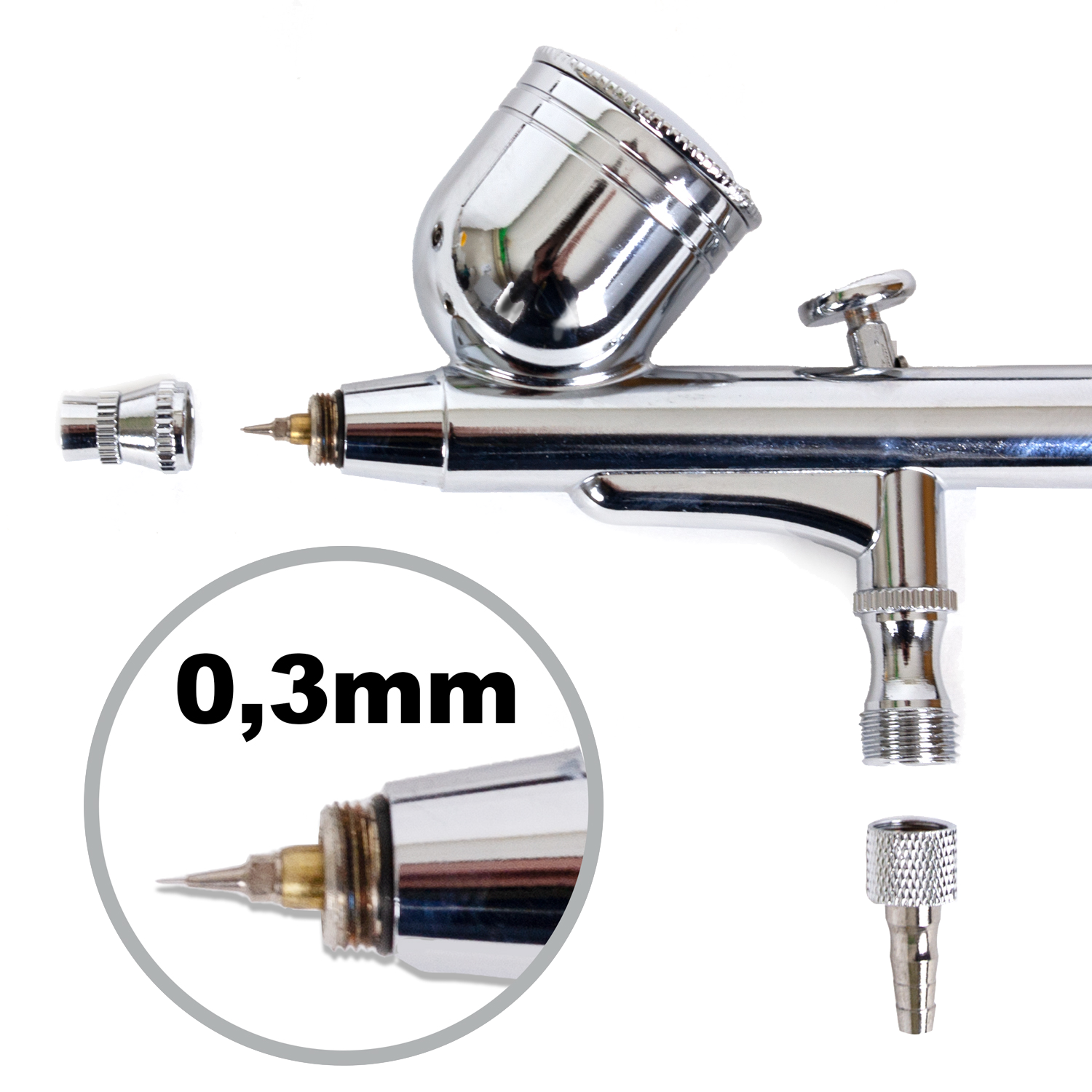 inklusive Profi-AirBrush Pistole “Gravity-Dual-Action” 130D und 1,8m Schlauch