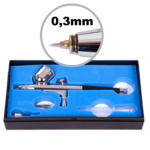 Die Airbrush-Pistole “Double-Action-Gun 130 D 0,3” ist ein Zweistoff-Zerstäuber, der nach dem Prinzip einer Strahlpumpe arbeitet, wobei Druckluft als Treibmittel verwendet wird. In Abhängigkeit von der Stärke des Luftstroms und der Menge der Farbe, kann man mit einer Airbushpistole feinste Linien aber auch große Flächen malen. Man kann Farbe deckend aufsprühen aber auch einen transparenten Farbfilm airbrushen.