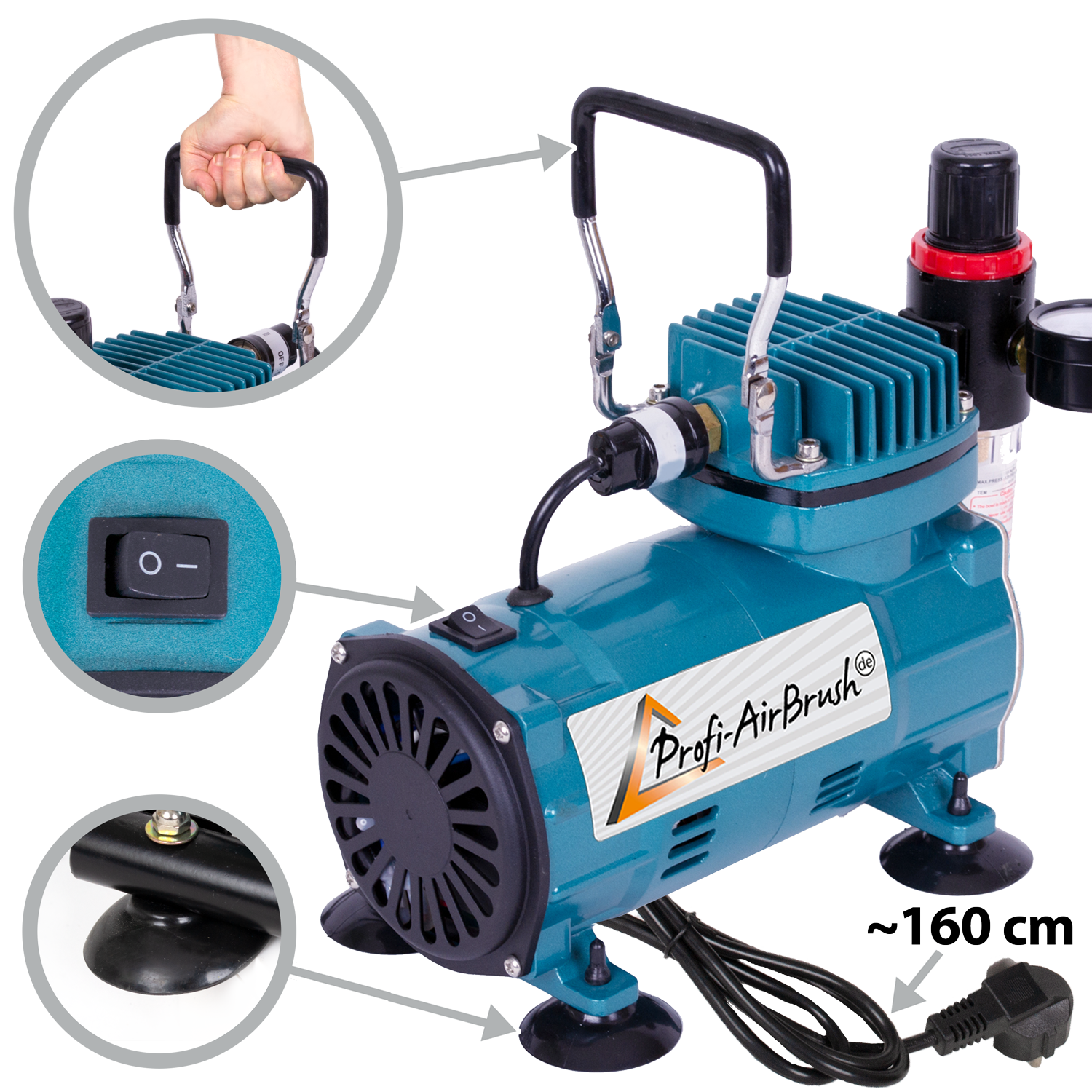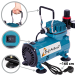 Das öl- und wartungsfreie Airbrush Kompressor Set Compact Mobil ist für Arbeiten mit allen handelsüblichen Airbrush Farben geeignet. Mit nur 47dB ermöglicht der Kompressor angenehmes Arbeiten auch in kleineren, geschlossenen Räumen. Sein kompaktes Design und der integrierte Tragegriff erleichtern den mobilen Einsatz. Die Abschaltautomatik ermöglicht einen stromsparenden Betrieb.