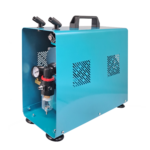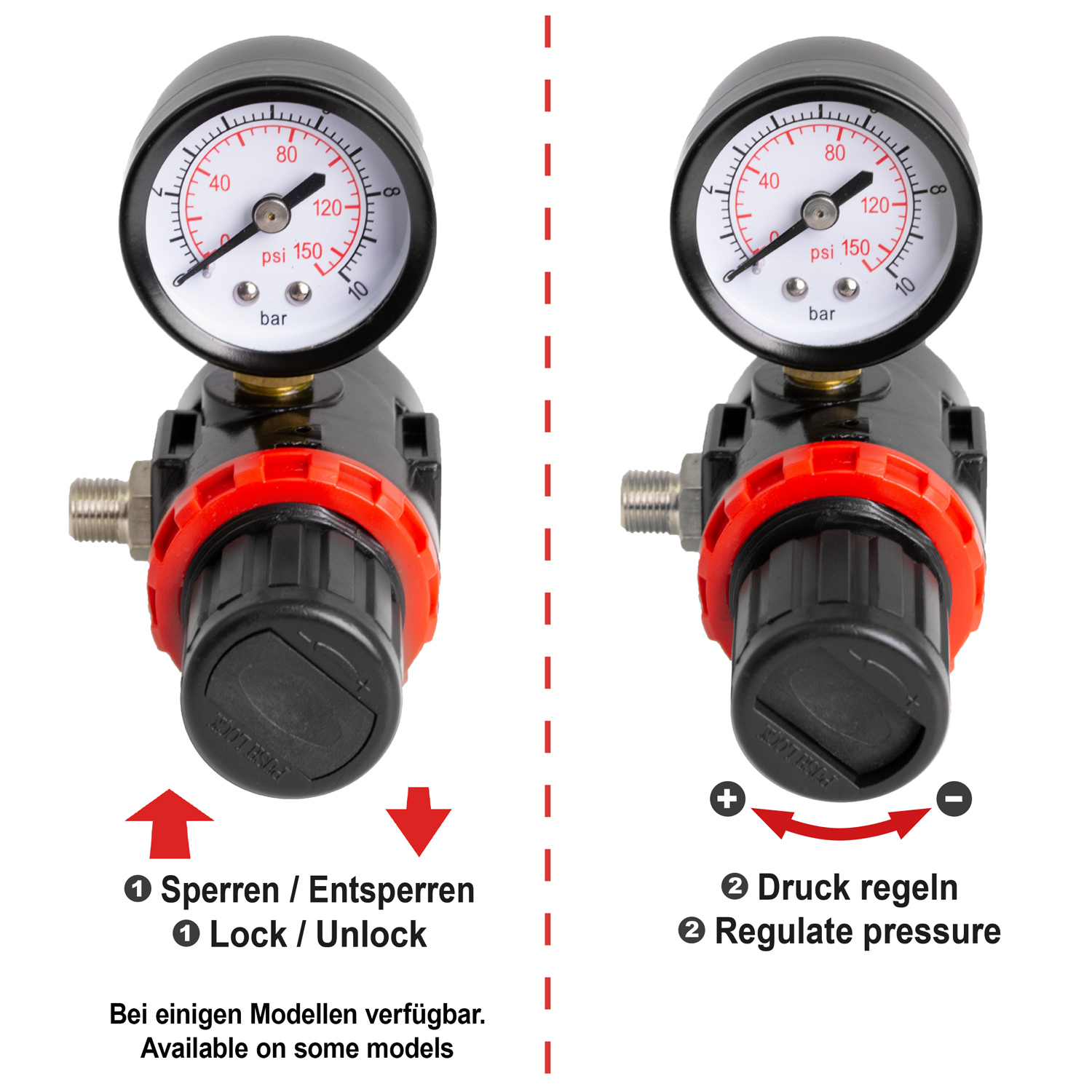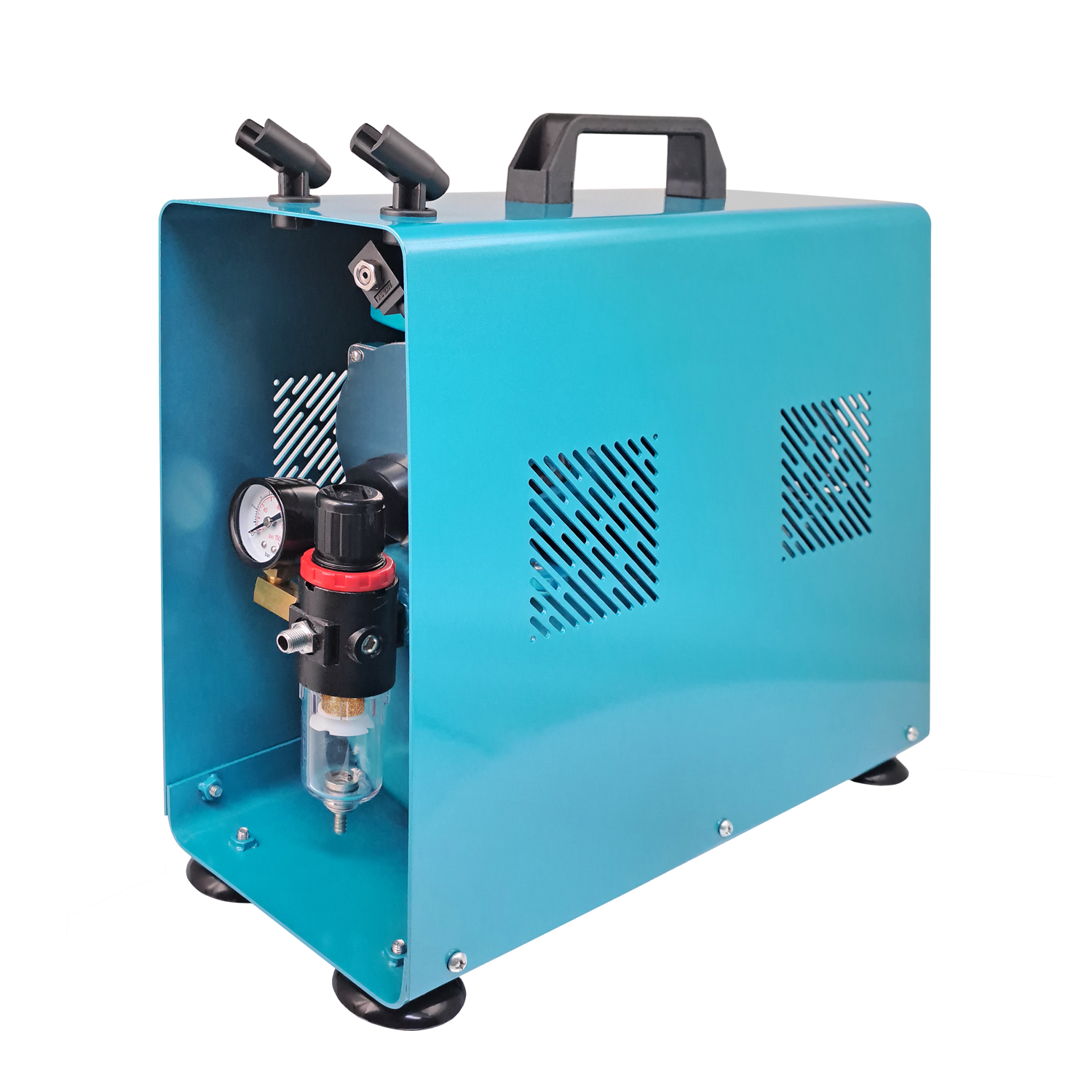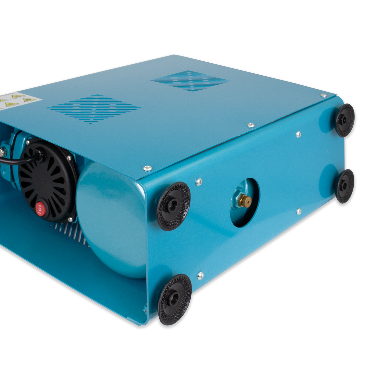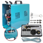 Der Airbrush-Kompressor ist ein energieeffizienter Zwei-Zylinder-Kolben-Kompressor. Er hat neben einem integrierten Lufttank auch einen integrierten Manometer, Luftfilter sowie Druck- und Durchflussregler. Im Lieferumfang des Airbrushkompressors mit Netzschalter ist außerdem ein Sicherheits- und Rückschlagventil enthalten.