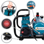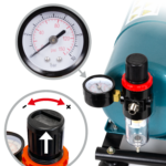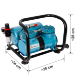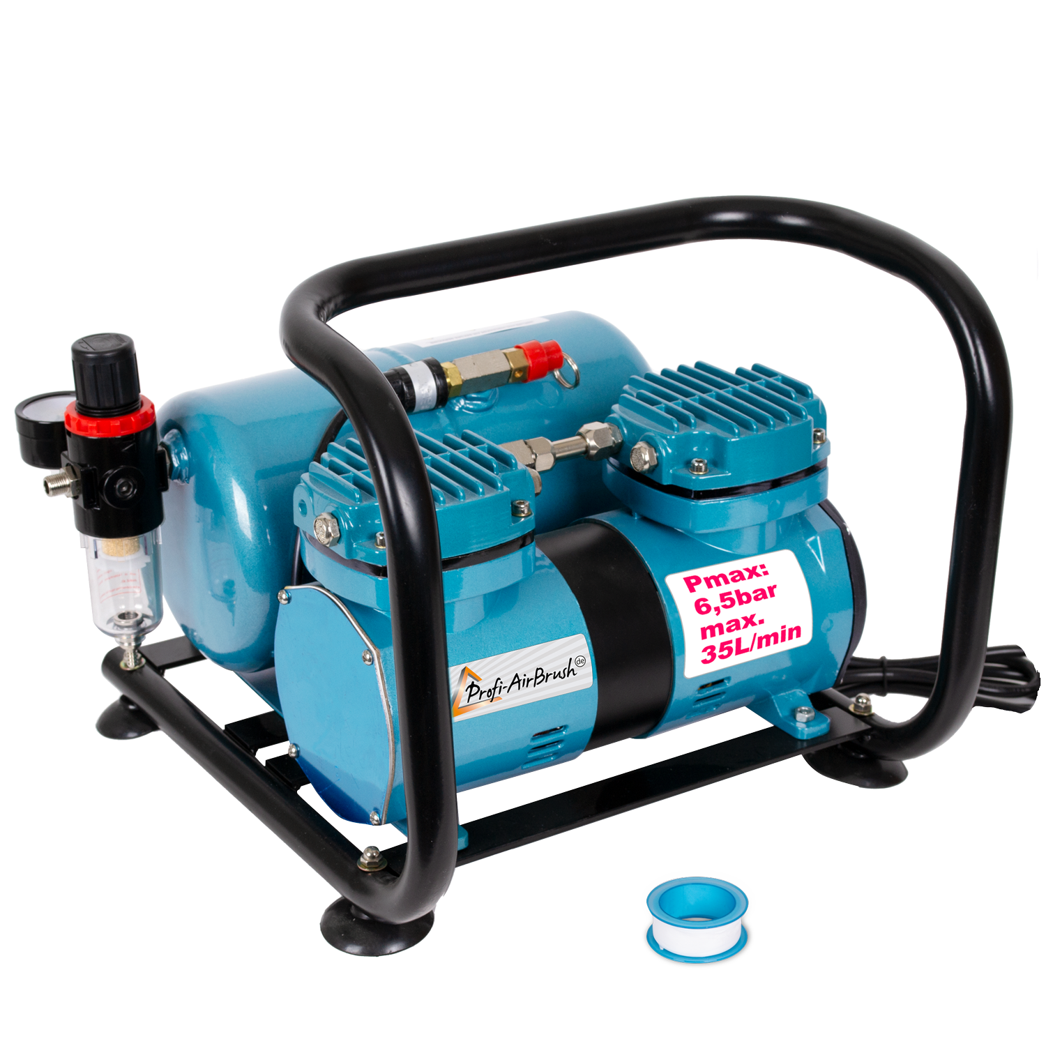 Der Airbrush-Kompressor ist mit einer Top-Technik ausgestattet: Es handelt sich um einen energieeffizienten Einzel-Zylinder-Kolbenkompressor für Airbrush. Integriert sind folgende Komponenten: Durchfluss- und Druckregler, Manometer und Wasserabschneider. Der Airbrushkompressor ist thermisch geschützt. Der maximale Arbeitsdruck des Airbrush-Kompressors beträgt 6,5 bar. Die maximale Luftabgabemenge pro Minute liegt bei 30 bis 35 Litern. Der Airbrush-Kompressor ist leicht zu bedienen und eignet sich für Anfänger und für Profis.