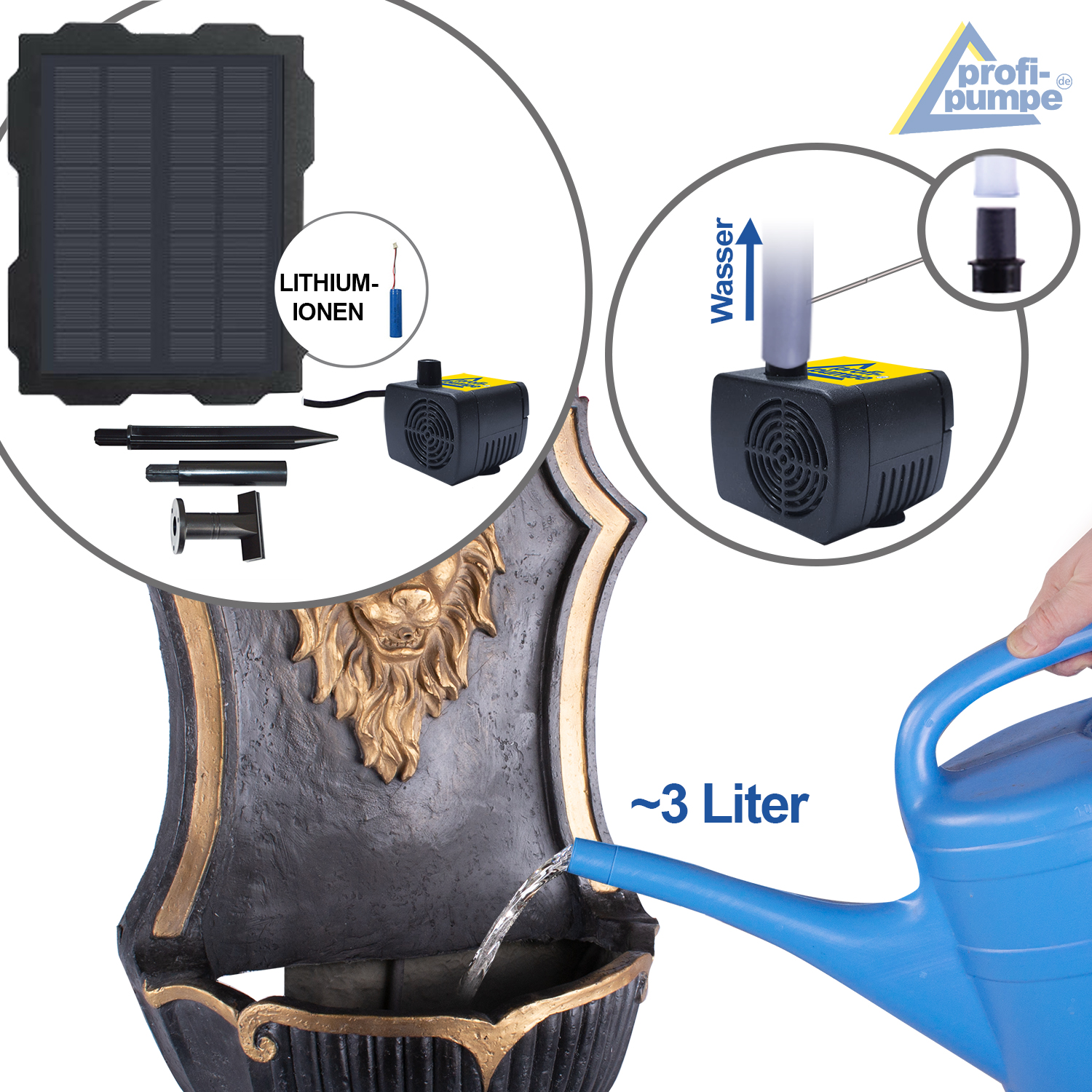 Na stránkách “VENEZIANO” ist ein Solarbrunnen für den Garten aus witterungsbeständigem Polyresin. Der stattliche Löwenkopf und die goldenen Verzierungen geben dem solarbetriebenen Springbrunnen ein mondänes, barockes Aussehen und machen den Gartenbrunnen zum perfekten Blickfang. Der Solarbrunnen mit Akku setzt die Kraft der Sonne in fließendes Wasser um. Hochwertige Komponenten bringen das Wasser in Bewegung, sobald das Sonnenlicht die Solarfläche erreicht. Das beruhigende Rauschen des Wassers erzeugt im Garten, auf dem Balkon oder der Terrasse eine entspannte Atmosphäre. Bei Sonneneinstrahlung fließt das Wasser aus dem Löwenmaul und wird mit der Pumpe wieder nach oben gefördert.