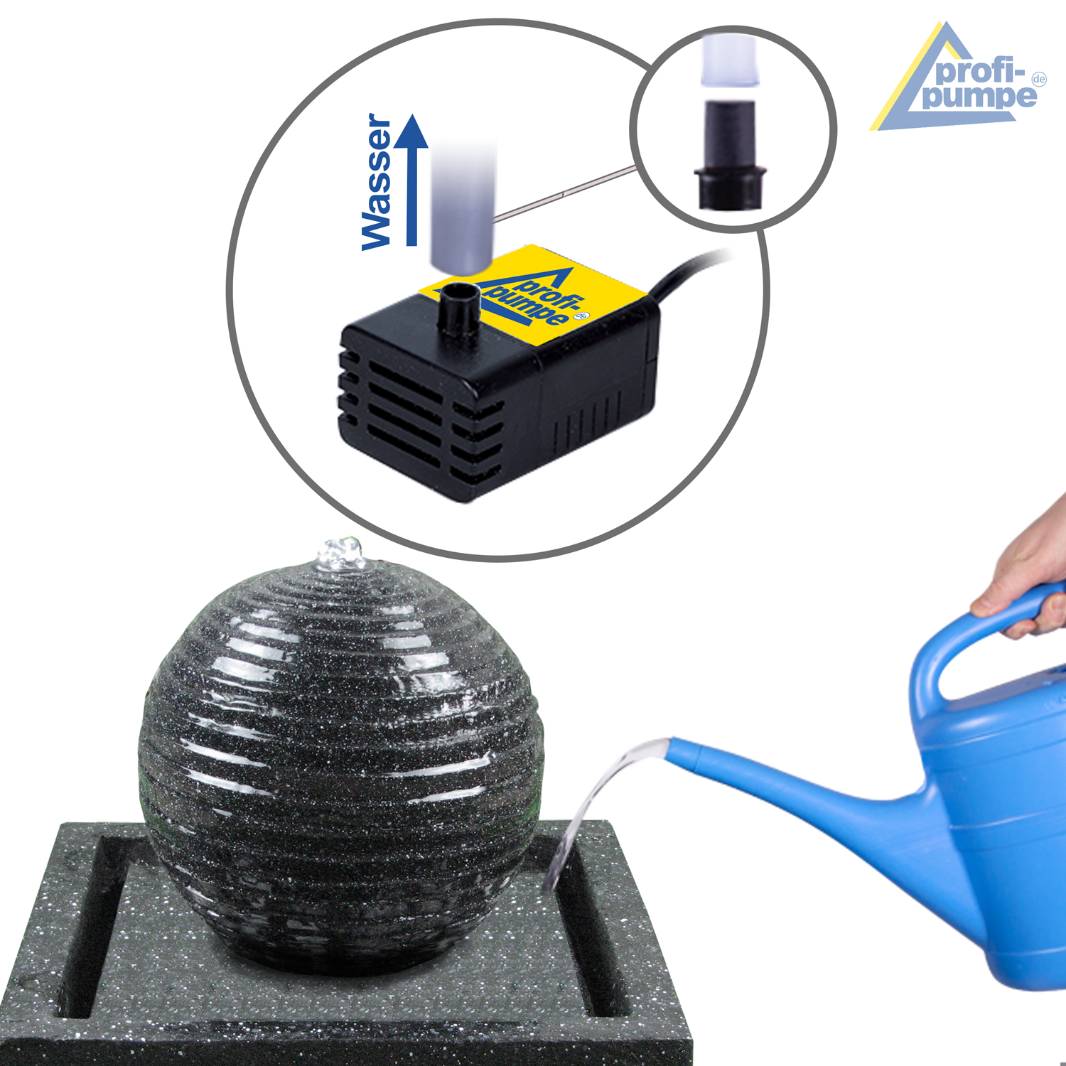 Die im Brunnen verbaute Solarpumpe ist nicht nur für den Betrieb bei Sonneneinstrahlung ausgelegt, wie herkömmliche Solarbrunnen. Dieser Solar Gartenbrunnen GRANIT-BLACK-2 hat einen Akku. Die maximale Förderleistung wird bei optimalen Bedingungen erreicht. Im Solarpanel ist ein Akku verbaut, der die Pumpe bei Sonneneinstrahlung auflädt, um den Betrieb des Solar-Wasserspiels auch nach Sonnenuntergang oder bei ungünstigen Lichtverhältnissen aufrecht zu erhalten. Die Pumpe schaltet sich am nächsten Tag automatisch in den Solarmodus, wenn die Sonne scheint. Die Akku-Funktion kann aber auch ausgeschaltet werden.