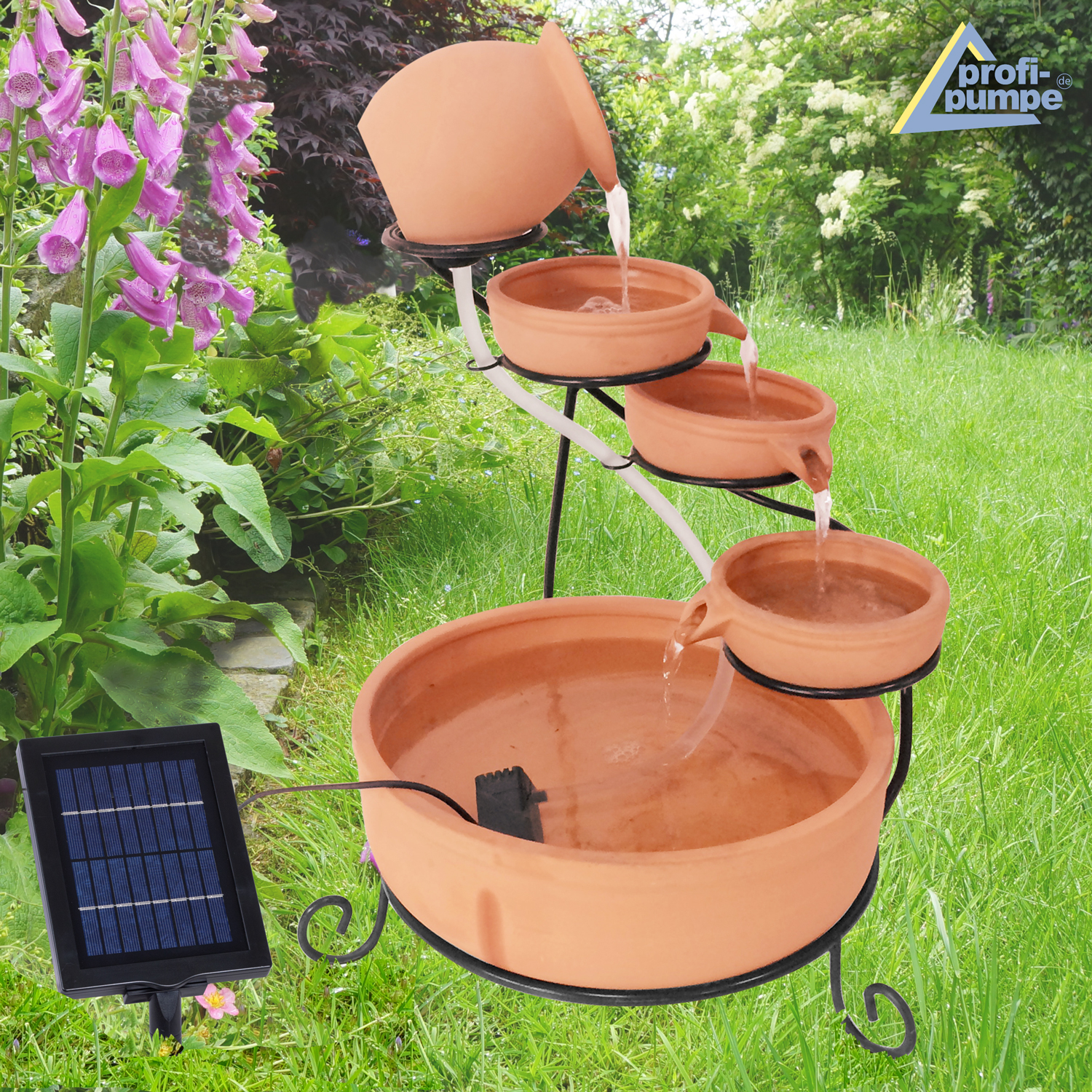 Der neue Hingucker für Ihren Garten wartet schon auf Sie! Der Solar Gartenbrunnen TERRA-3 verursacht keinerlei Betriebskosten. Sobald das Sonnenlicht die Solarfläche erreicht, bringen die hochwertigen Komponenten des Solarbrunnens das Wasser in Bewegung. Das beruhigende Rauschen des Wassers erzeugt im Garten, auf dem Balkon oder der Terrasse eine entspannte Atmosphäre. Das glitzernde Wasser im Sonnenlicht fließt beruhigend von einer Schale in die nächste und wird mit der Pumpe wieder nach oben gefördert. Sorgen Sie für mehr Wohlgefühl in Ihrem Garten! An heißen Sommertagen erzeugt der Solarbrunnen ein angenehmes Mikroklima.