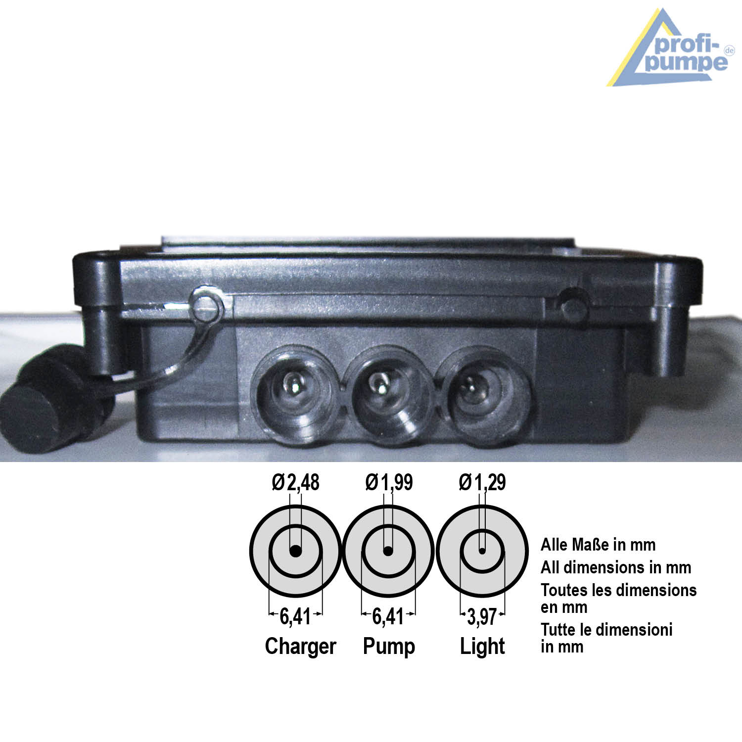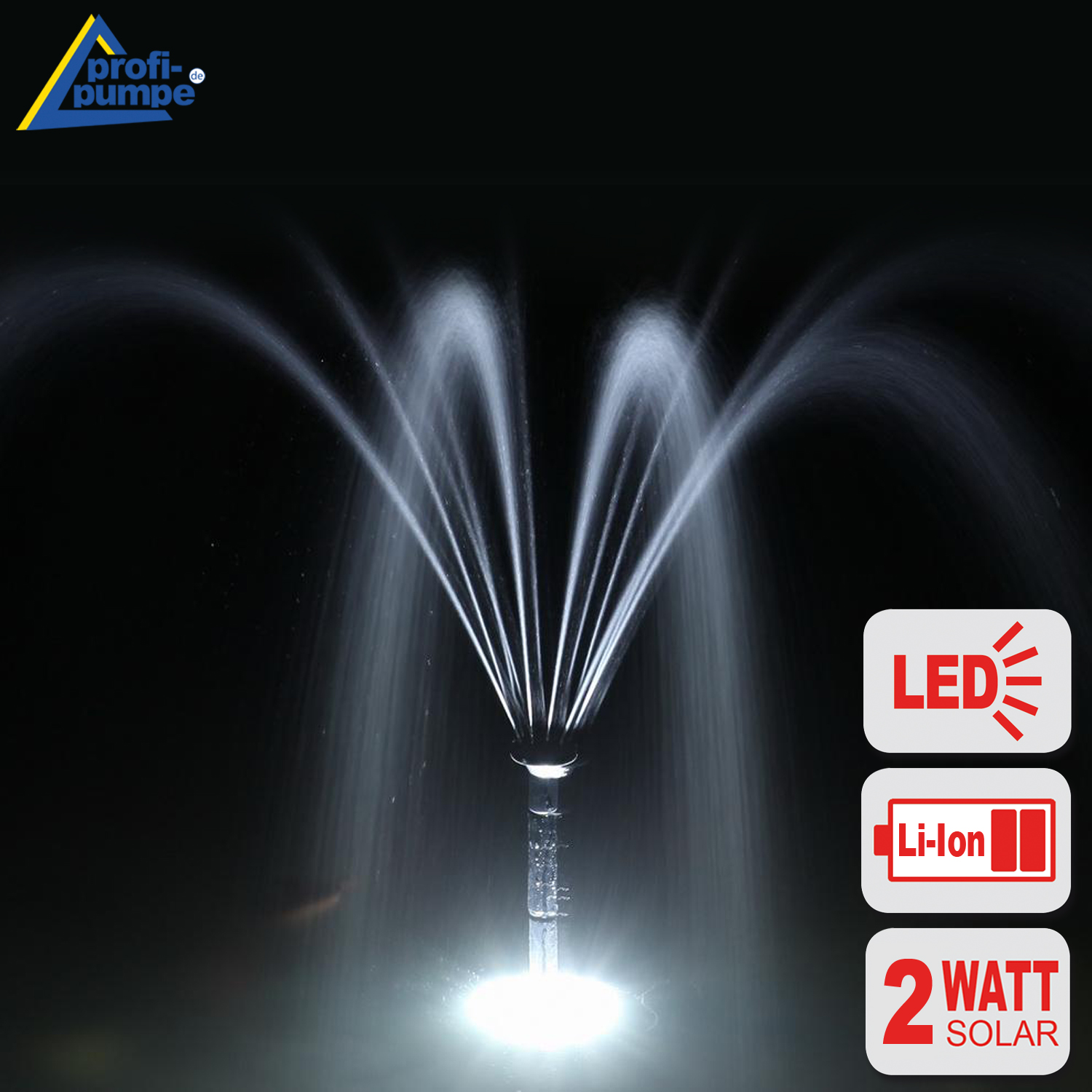 Neu ist auch das innovative Tag & Nacht Steuerungs- und Ladesystem. Ist gerade ausreichend Sonnenlicht vorhanden, so wird damit nur die Solarpumpe versorgt. Ist mehr Sonnenintensität vorhanden, als für den reinen Pumpenbetrieb nötig, so wird mit der überschüssigen Energie der Akku geladen ist. Sinkt an bewölkten Tagen die Sonnenintensität auf ein Minimum, so wird damit der Akku geladen, bis der Akku-Ladezustand ausreicht, die Pumpe zu betreiben. Dann wird die Pumpe gestartet. Bei einsetzender Dämmerung und geladenem Akku wird automatisch auf Nachtbetrieb umgeschaltet. Das LED-Licht geht an und die Pumpe läuft bis zum Akku-Mindestladezustand. Der Akku-Mindestladezustand gewährleistet eine lange AKKU-Lebensdauer. Am nächsten Tag wird wieder zunächst der Akku aufgeladen und dann die Pumpe (ohne Licht) gestartet.