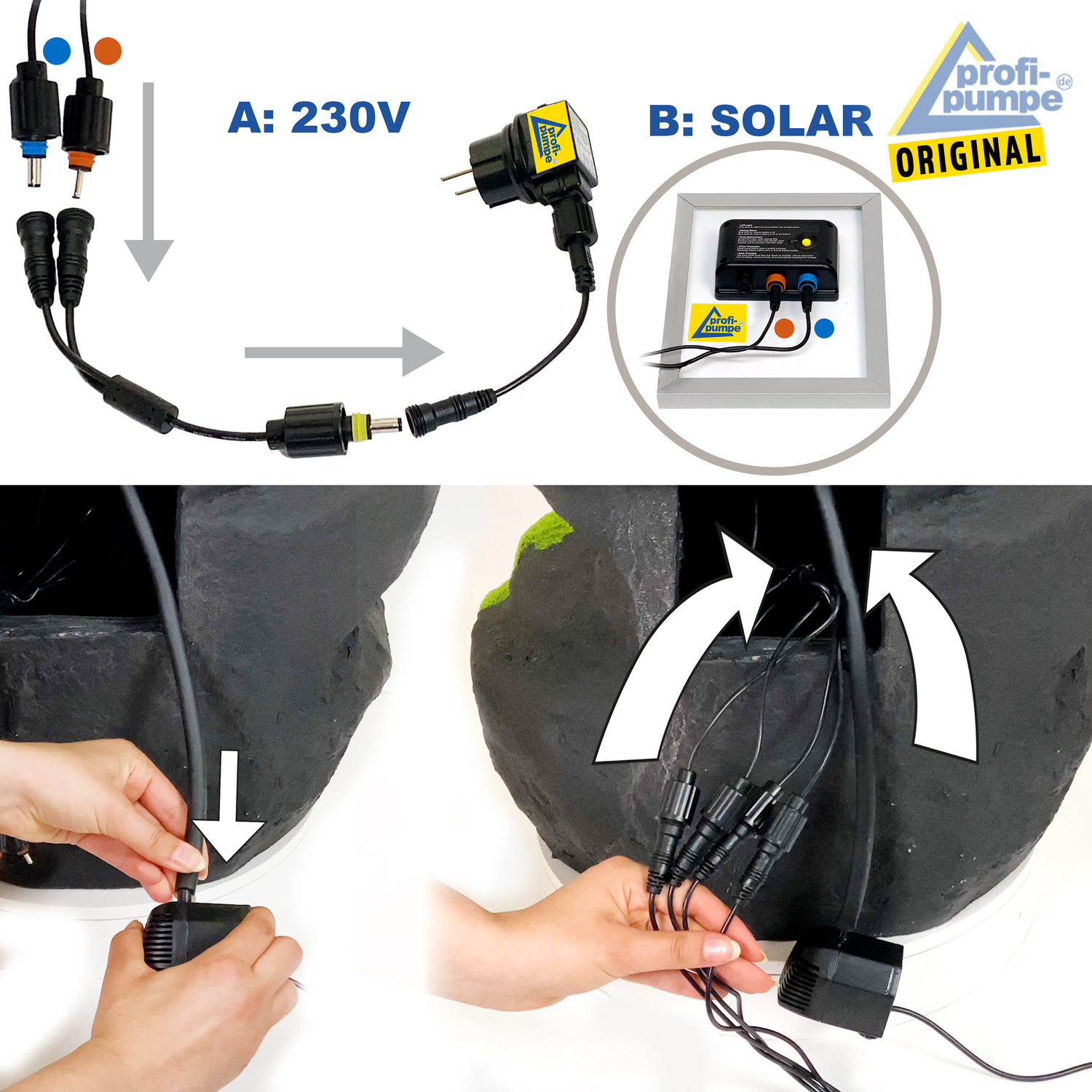 Der rustikale Zierbrunnen “FELS-KASKADE geschwungen” als Basisversion ist für den 230-Volt-Betrieb vorgesehen. Die Pumpe und die LEDs werden mit sicherer 12V-Niederspannung betrieben (Adapter im Lieferumfang enthalten). Alle Kabelverbindungen sind verpolungssicher und wasserdicht. Der Aufbau geht einfach und schnell.