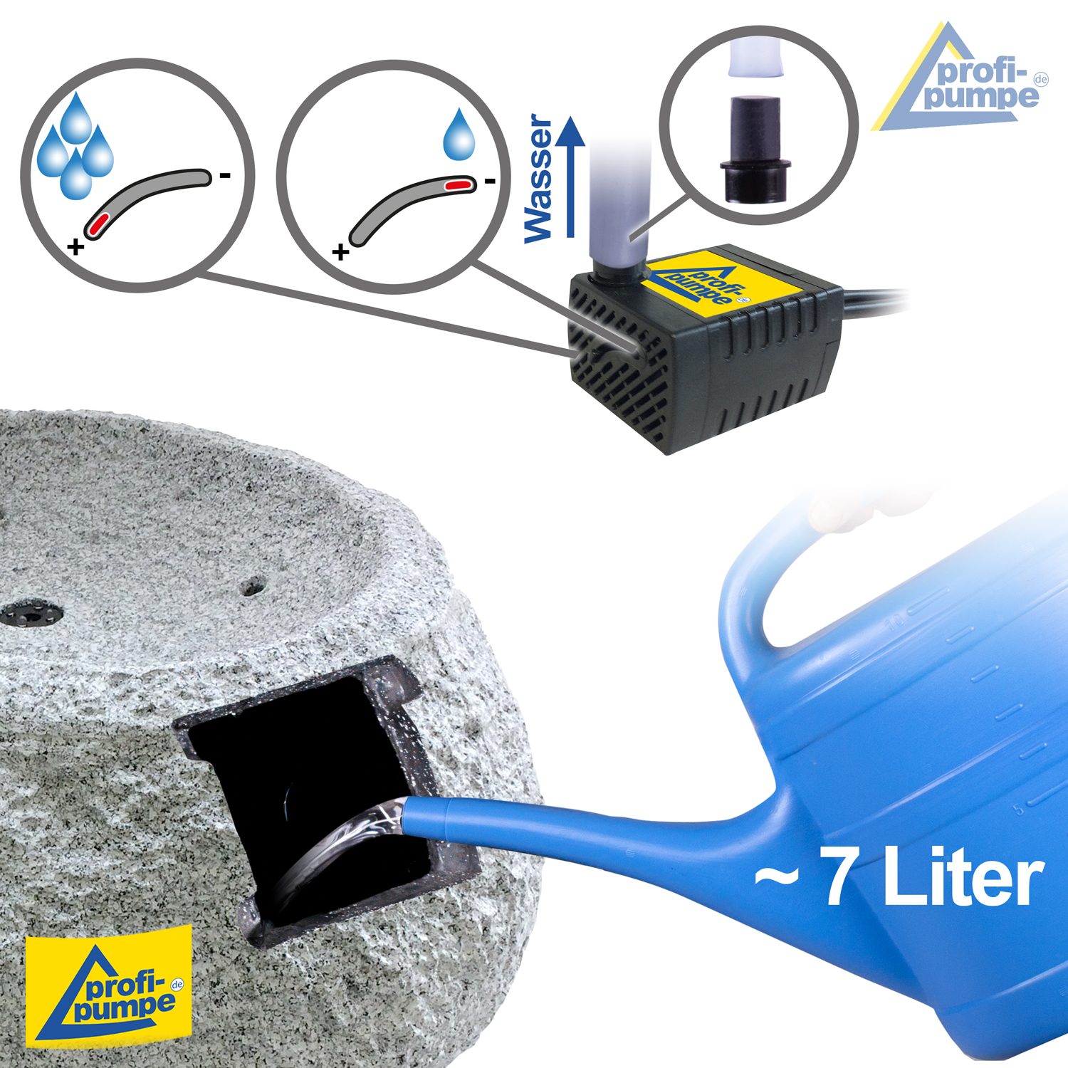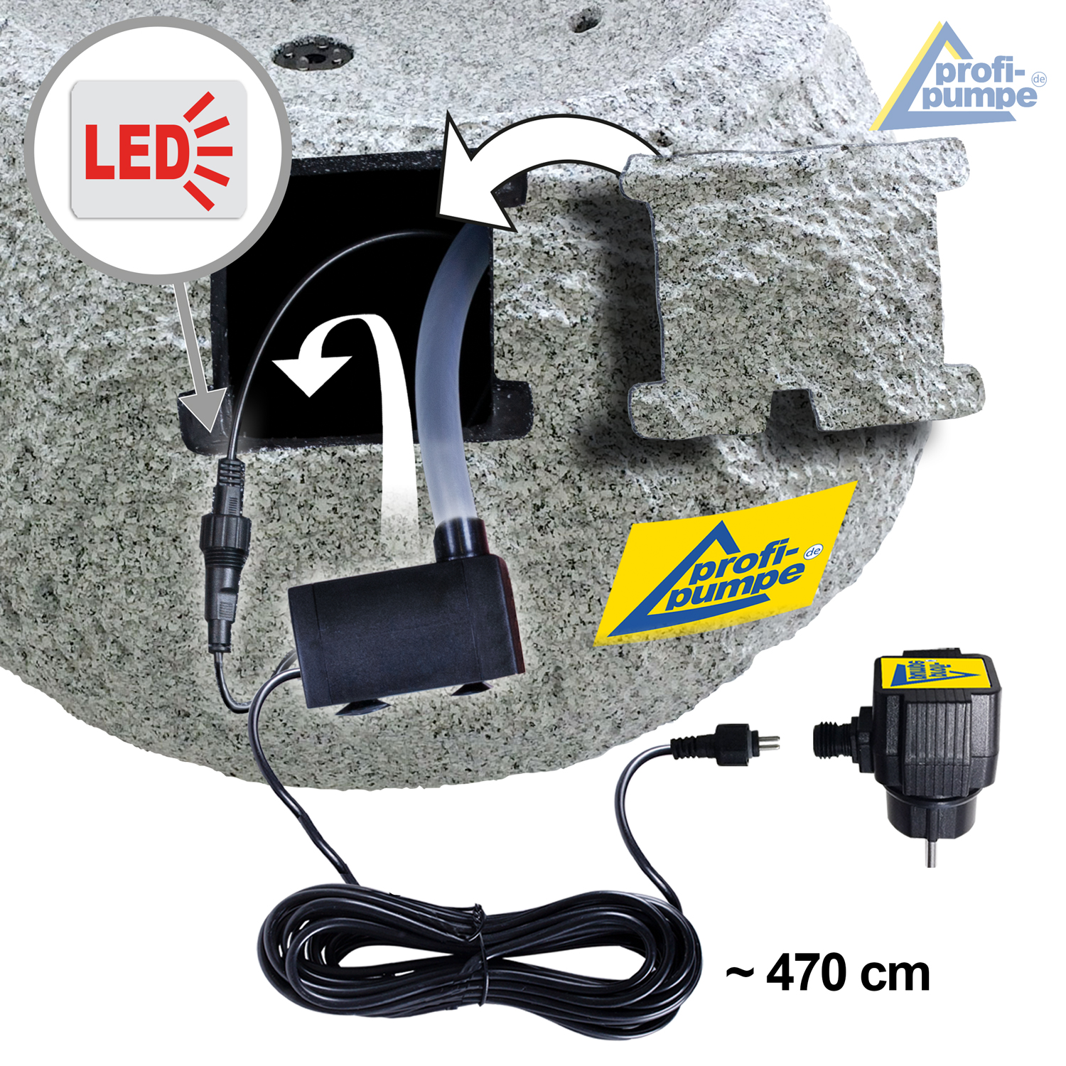 Der Wasserbrunnen ist für den 230-Volt-Betrieb vorgesehen. Die Pumpe und die LEDs werden mit sicherer 12V-Niederspannung betrieben (Adapter im Lieferumfang enthalten). Alle Kabelverbindungen sind verpolungssicher, wasserdicht und absolut funktionssicher. Dank praktischer Steckverbindungen sind alle Komponenten jederzeit austauschbar. So können Sie den Wasserbrunnen mit der effektvollen LED-Beleuchtung und das fließende Wasser jahrelang genießen!