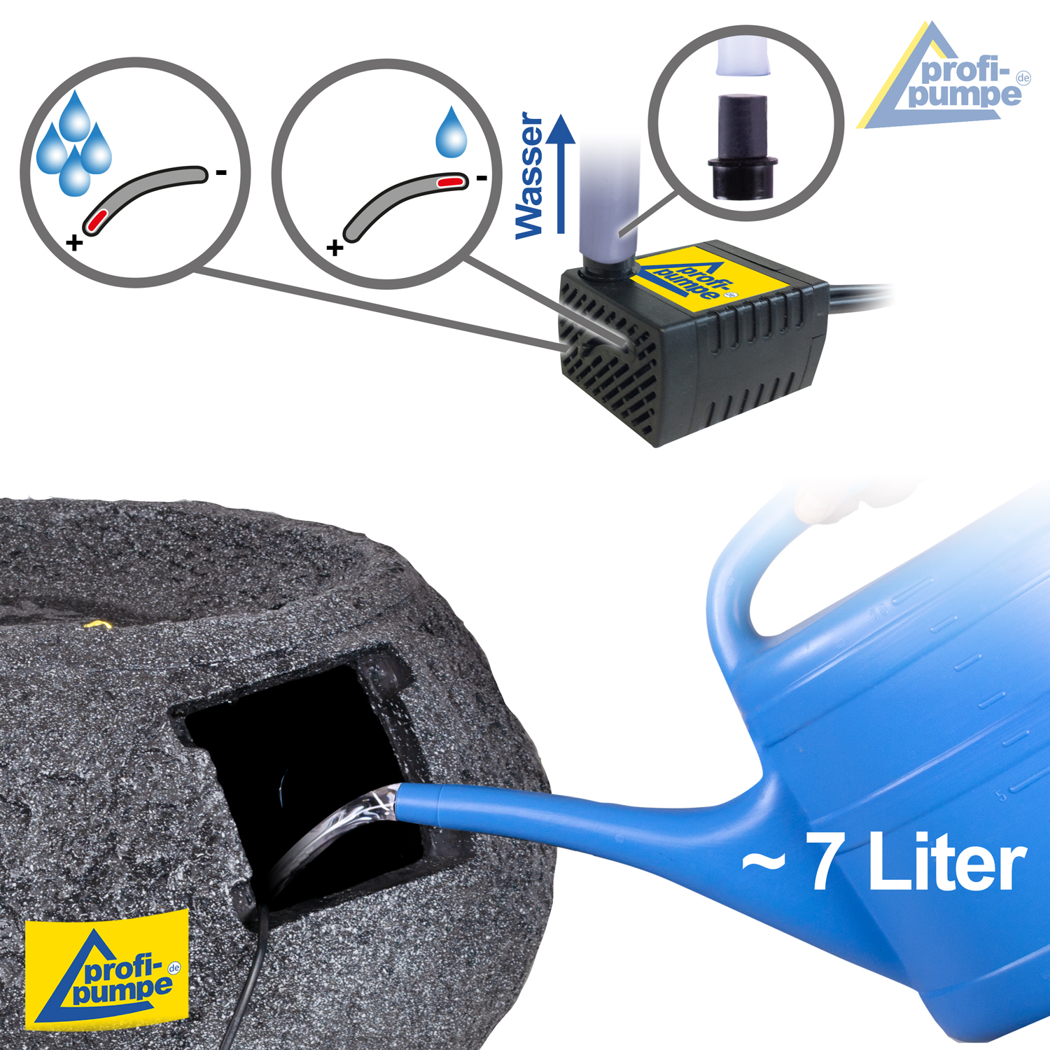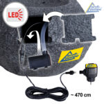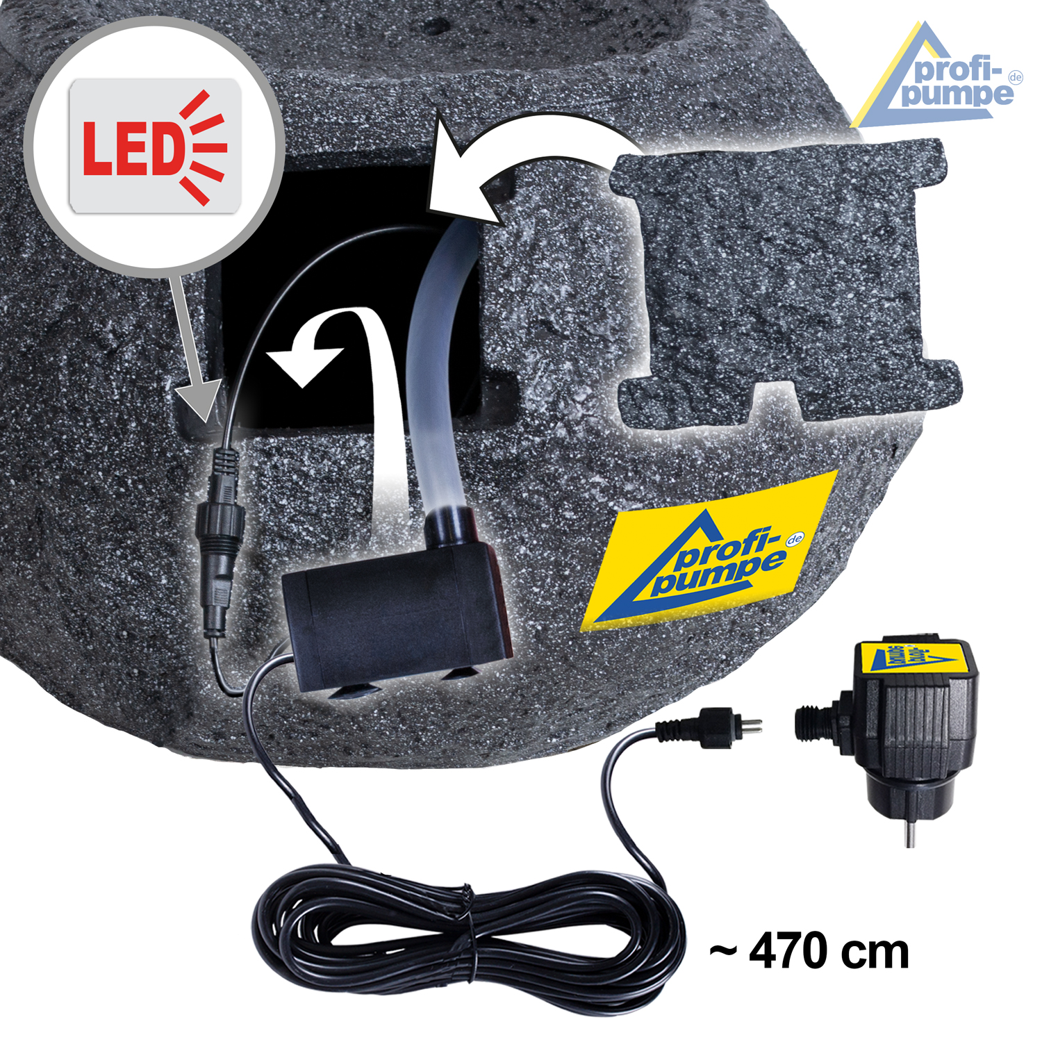 Der Wasserbrunnen ist für den 230-Volt-Betrieb vorgesehen. Die Pumpe und die LEDs werden mit sicherer 12V-Niederspannung betrieben (Adapter im Lieferumfang enthalten). Alle Kabelverbindungen sind verpolungssicher, wasserdicht und absolut funktionssicher. Dank praktischer Steckverbindungen sind alle Komponenten jederzeit austauschbar. So können Sie den Wasserbrunnen mit der effektvollen LED-Beleuchtung und das fließende Wasser jahrelang genießen!