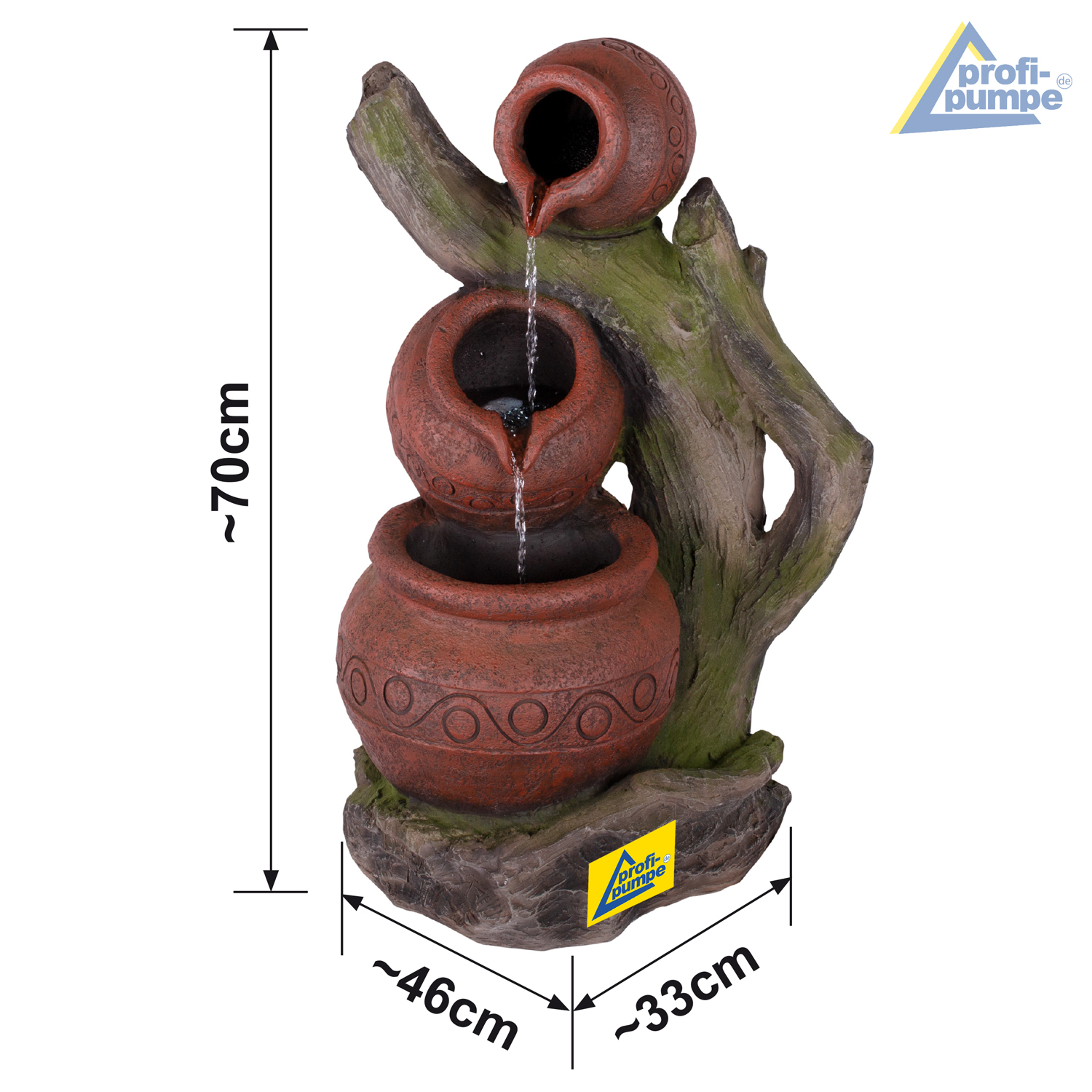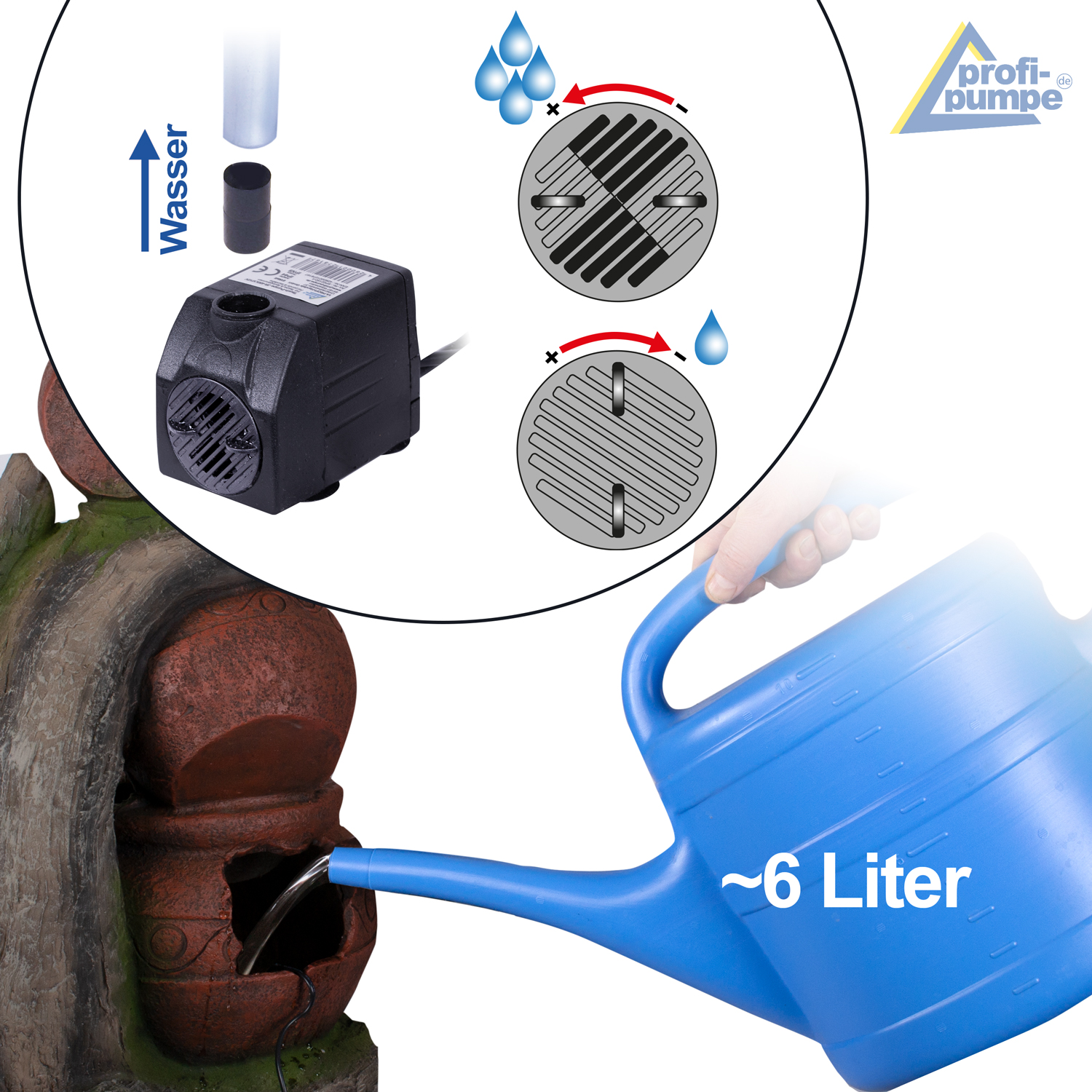 Der rustikale Zierbrunnen KELTEN-ZAUBER ist für den 230-Volt-Betrieb vorgesehen. Die Pumpe und die LEDs werden mit sicherer 12V-Niederspannung betrieben (Adapter im Lieferumfang enthalten). Alle Kabelverbindungen sind verpolungssicher, wasserdicht, absolut funktionssicher. Dank praktischer Steckverbindungen sind alle Komponenten jederzeit austauschbar. So können Sie den Wasserbrunnen KELTEN-ZAUBER und das fließende Wasser jahrelang genießen!