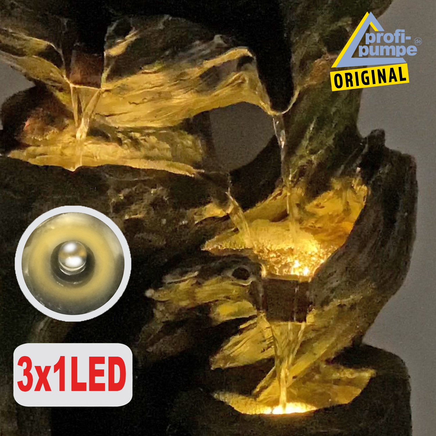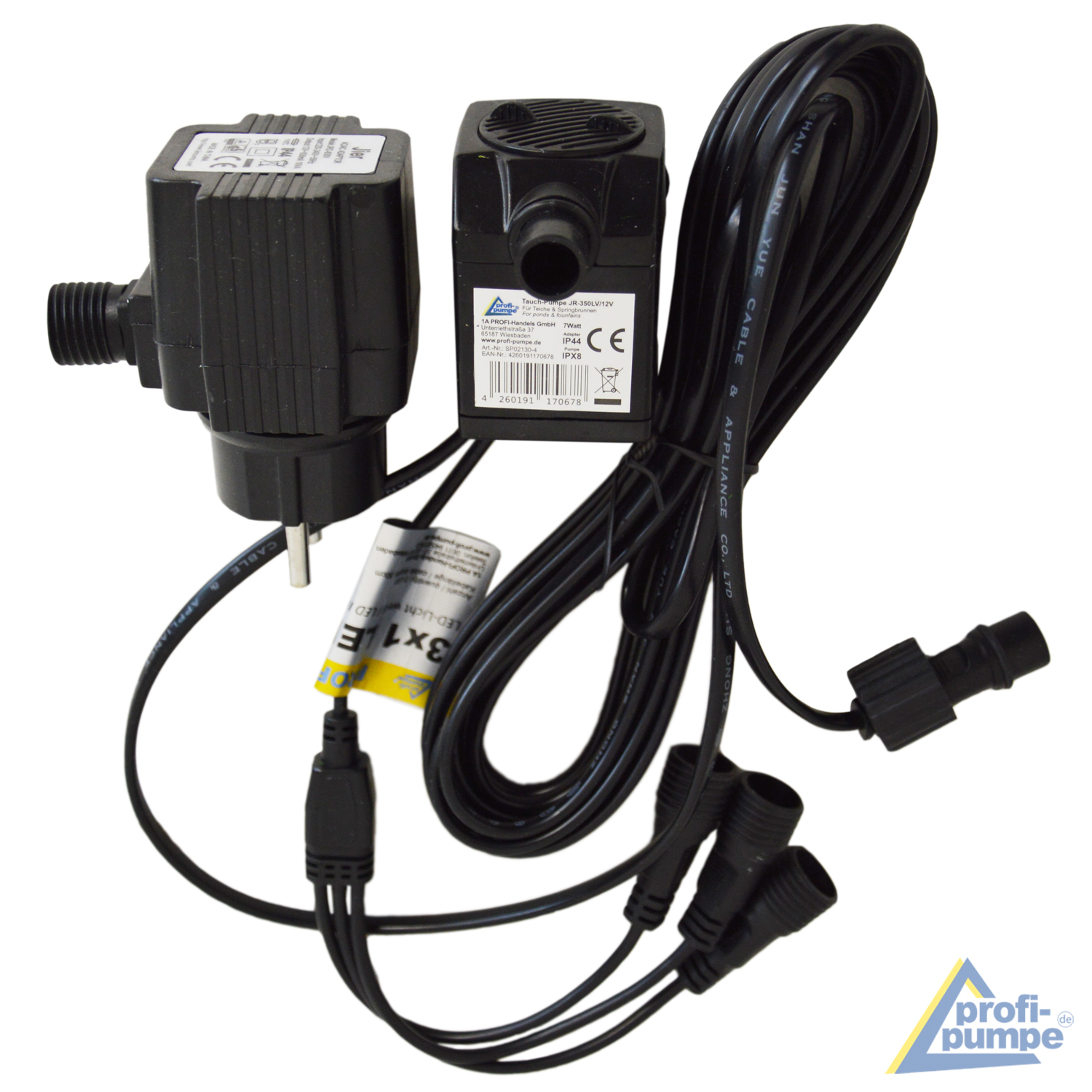 - Mit 230V/12V-Anschluss, 7 Watt Pumpe, LED-Ring in warmem Weiß