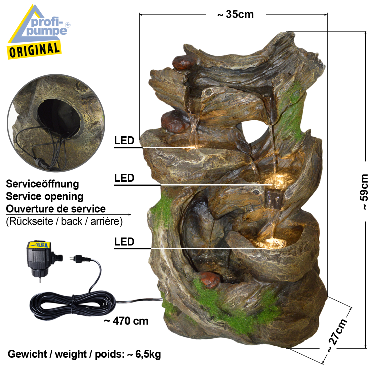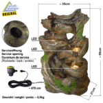 Der rustikale Zierbrunnen “MÄRCHENWALD” ist für den 230-Volt-Betrieb vorgesehen. Die Pumpe und die LEDs werden mit sicherer 12V-Niederspannung betrieben (Adapter im Lieferumfang enthalten). Alle Kabelverbindungen sind verpolungssicher, wasserdicht, absolut funktionssicher. Dank praktischer Steckverbindungen sind alle Komponenten jederzeit austauschbar. So können Sie den Wasserbrunnen “MÄRCHENWALD” und das fließende Wasser jahrelang genießen!