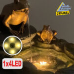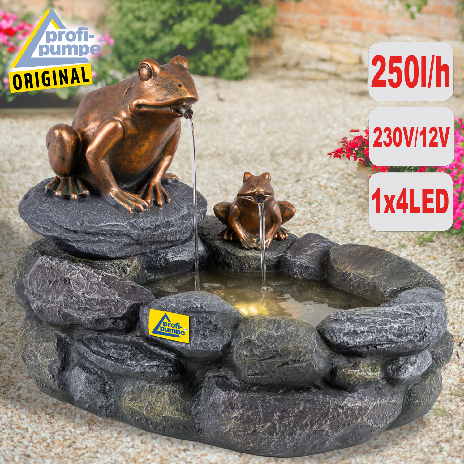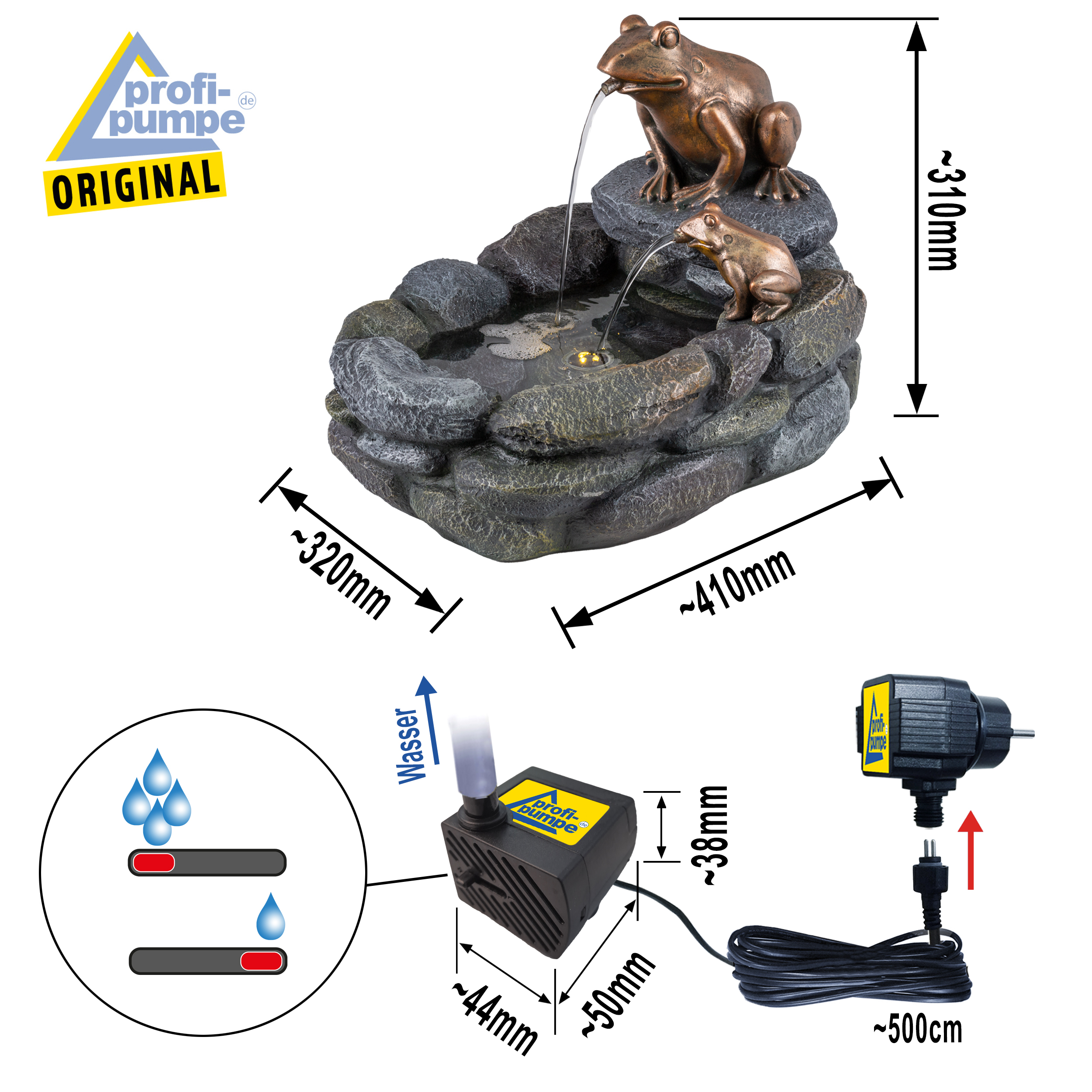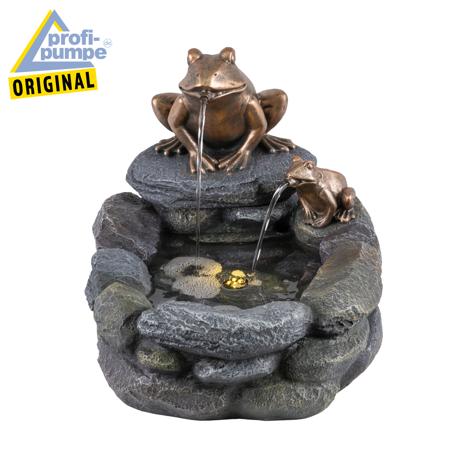 Ein großer und ein kleiner Frosch sitzen am Rande eines Felsen-Beckens und speien Wasser in die Tiefe. Der 230V – Gartenbrunnen & Wasserspiel “TEICH-KÖNIG” mit LED-Licht ist für den Innen- und Außenbereich geeignet. Betrieben wird der Garten- und Zimmerbrunnen mit einem 230/12-Volt Netzadapter. Mit der Stein-Dekoration sorgt der Zierbrunnen für eine naturnahe Atmosphäre und Entspannung. Ganz gleich, wo der In- und Outdoor-Brunnen aufgestellt wird – dieser wassersprudelnde Blickfang wertet jeden Standort auf. Das Lebenselixier Wasser belebt Wohnzimmer, Esszimmer, Flure und Eingangsbereiche, Wintergärten oder Balkone, Terrassen und Gärten im privaten wie gewerblichen Umfeld.