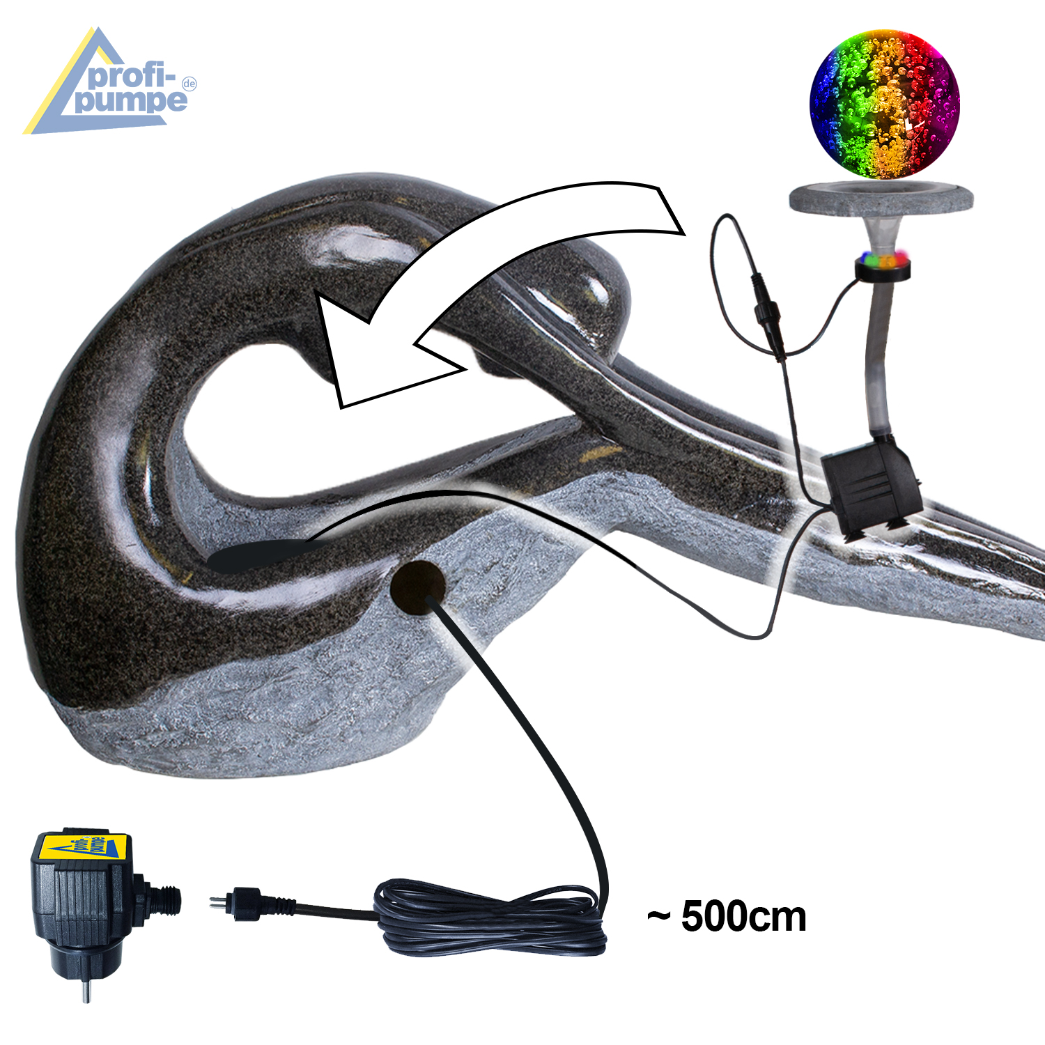 Der Wasserbrunnen ist für den 230-Volt-Betrieb vorgesehen. Die Pumpe und die LEDs werden mit sicherer 12V-Niederspannung betrieben (Adapter im Lieferumfang enthalten). Alle Kabelverbindungen sind verpolungssicher, wasserdicht und absolut funktionssicher. Dank praktischer Steckverbindungen sind alle Komponenten jederzeit austauschbar. So können Sie den Wasserbrunnen mit der effektvollen LED-Beleuchtung und das fließende Wasser jahrelang genießen!