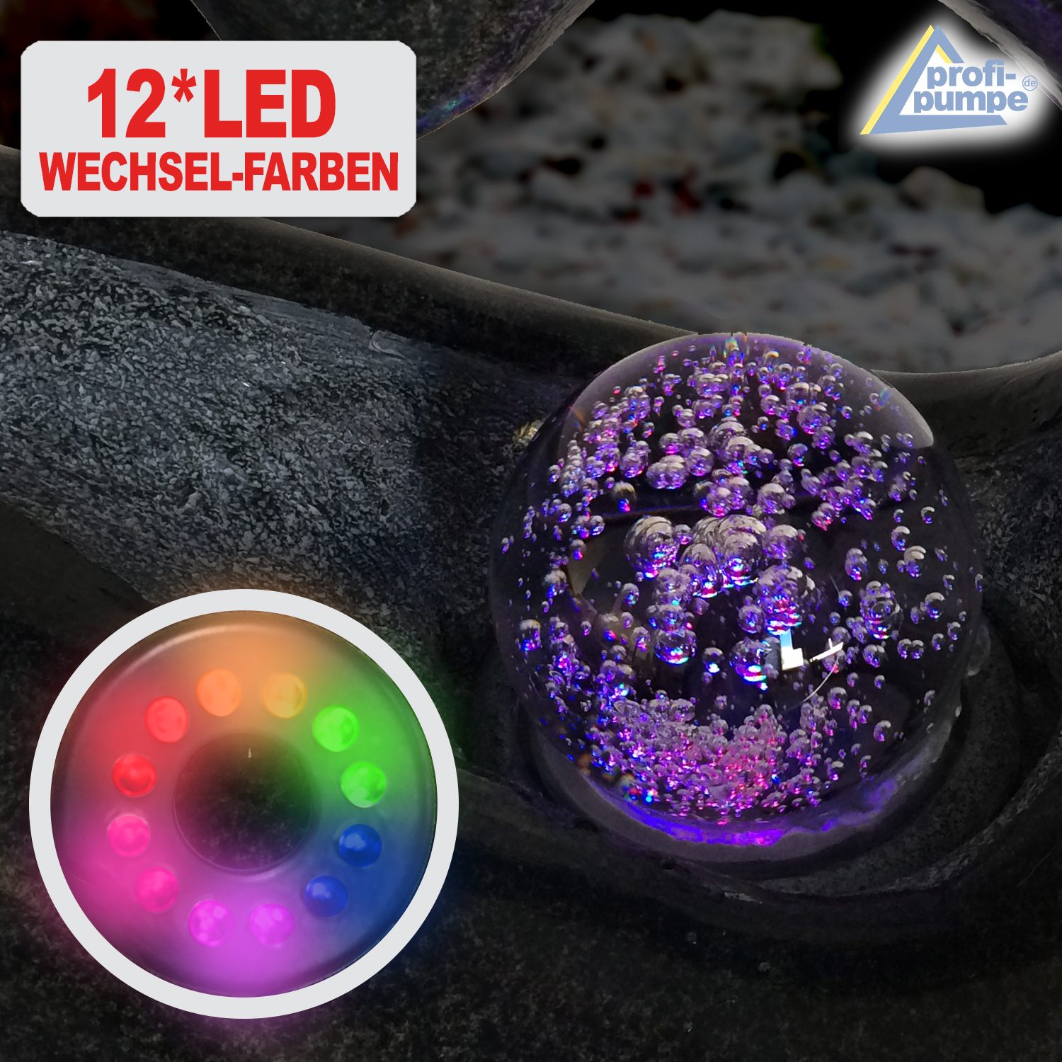 • LED-Gartenbrunnen für den Innen- und Außenbereich mit 230/12V-Netzadapter