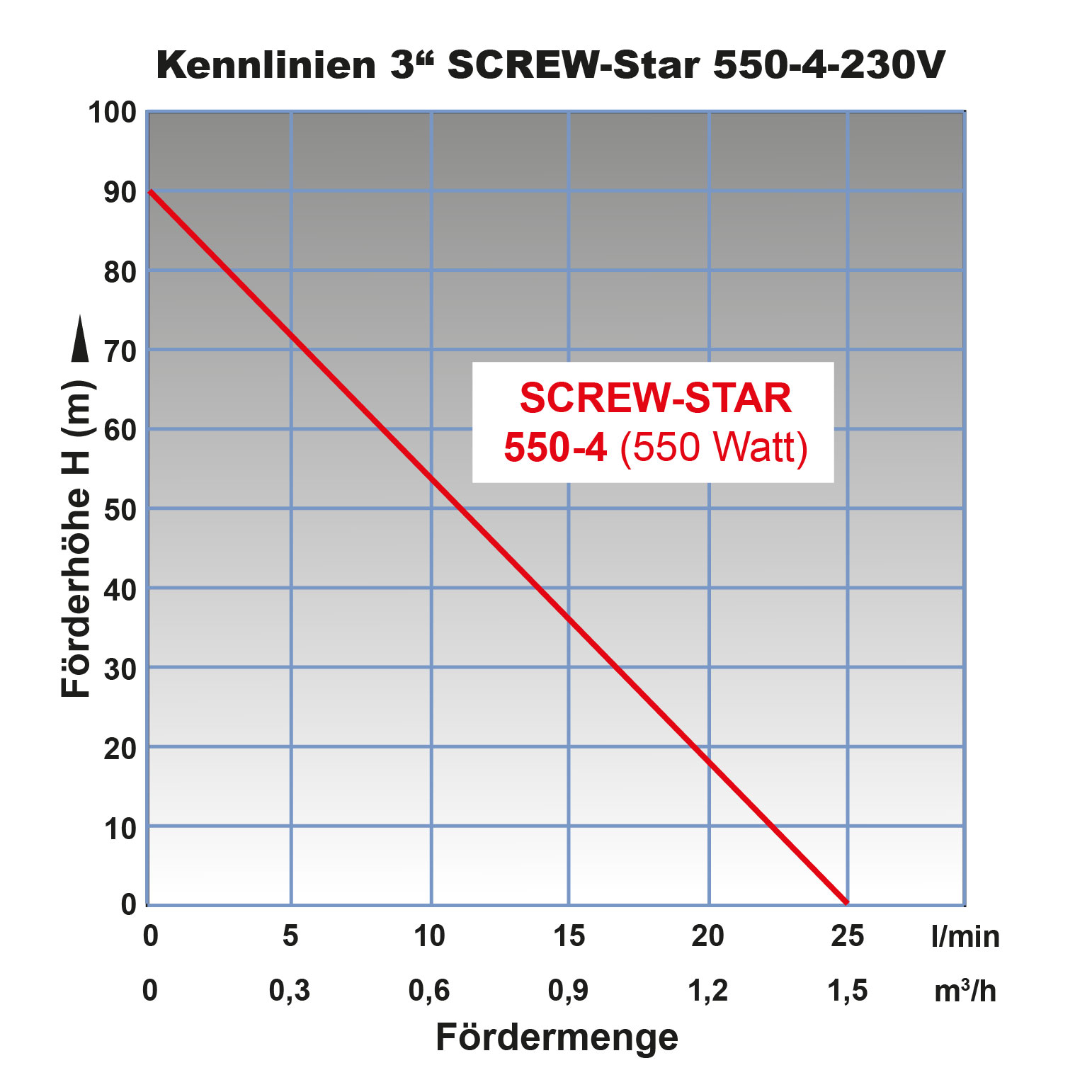 Die maximale Fördermenge beträgt 1.500L/h, die maximale Förderhöhe 90m und der maximale Förderdruck 9bar. Bitte beachten Sie, dass die Fördermenge bei steigender Förderhöhe entsprechend abnimmt.