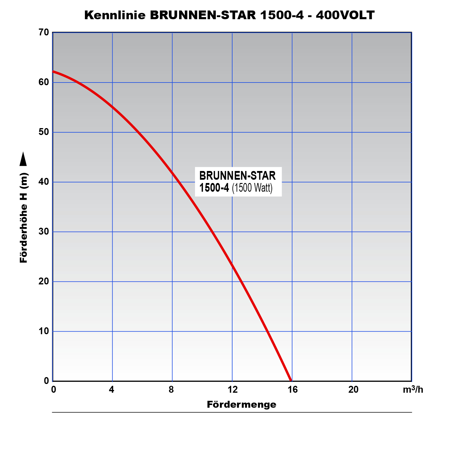 Die leistungsstarke Tiefbrunnenpumpe hat einen hochwertigen gekapselten Motor und erbringt Fördermenge von bis zu 16.000l/h. Die maximale Förderhöhe beträgt 62m und der maximale Förderdruck liegt bei 6,2bar. Bitte beachten Sie, dass die Förderleistung bei steigender Förderhöhe entsprechend abnimmt.