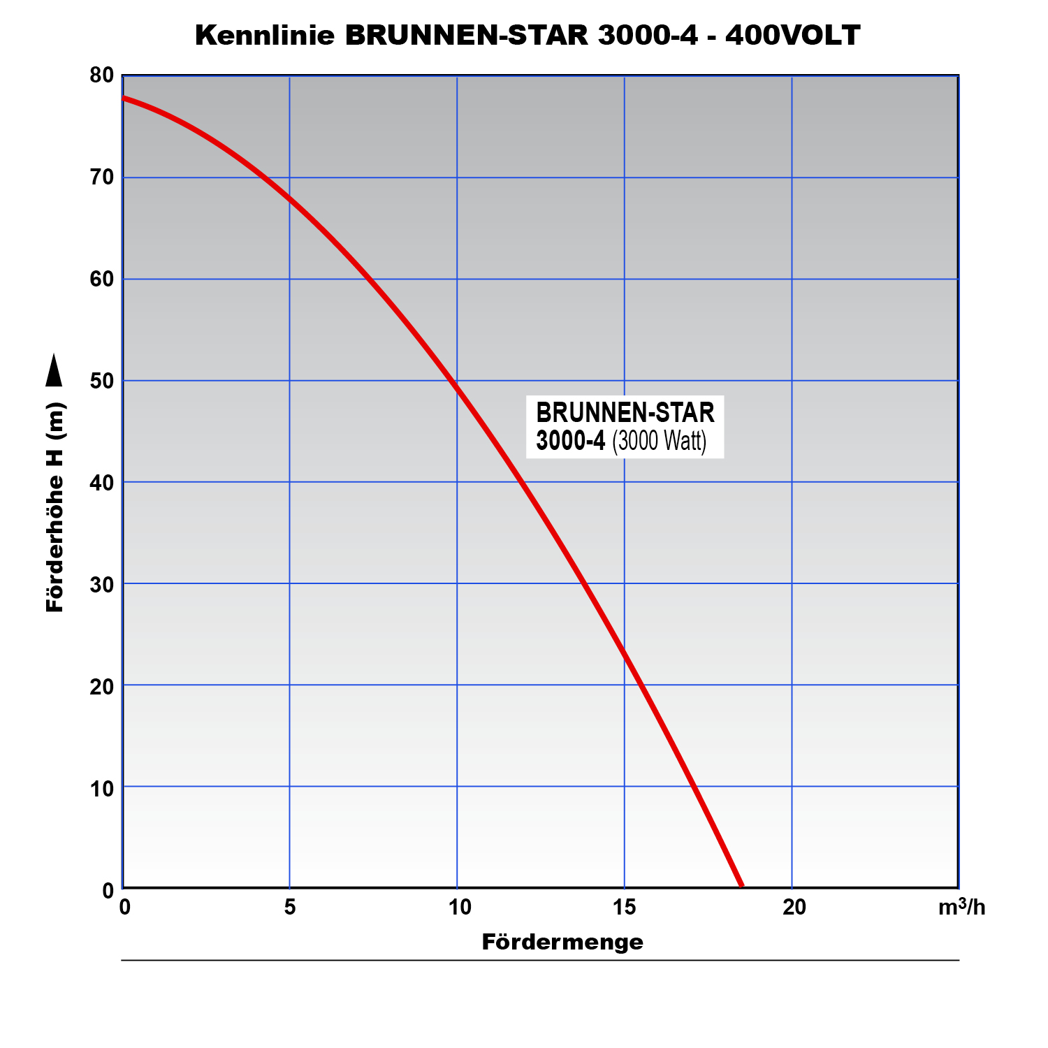 Die leistungsstarke Tiefbrunnenpumpe hat einen hochwertigen gekapselten Motor und erbringt Fördermenge von bis zu 18.000l/h. Die maximale Förderhöhe beträgt 78m und der maximale Förderdruck liegt bei 7,8bar. Bitte beachten Sie, dass die Förderleistung bei steigender Förderhöhe entsprechend abnimmt.