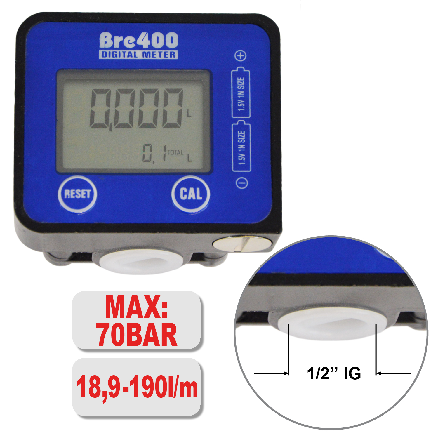 Der BRE400 kann als Messwerte Liter, Quarts, Pints und Gallonen anzeigen. Bei Auslieferung ist als Maßeinheit Liter voreingestellt. Das Display wird von zwei Typ LR1N-Batterien mit einer Betriebsdauer von ca. 8.000 Std. mit Strom versorgt.