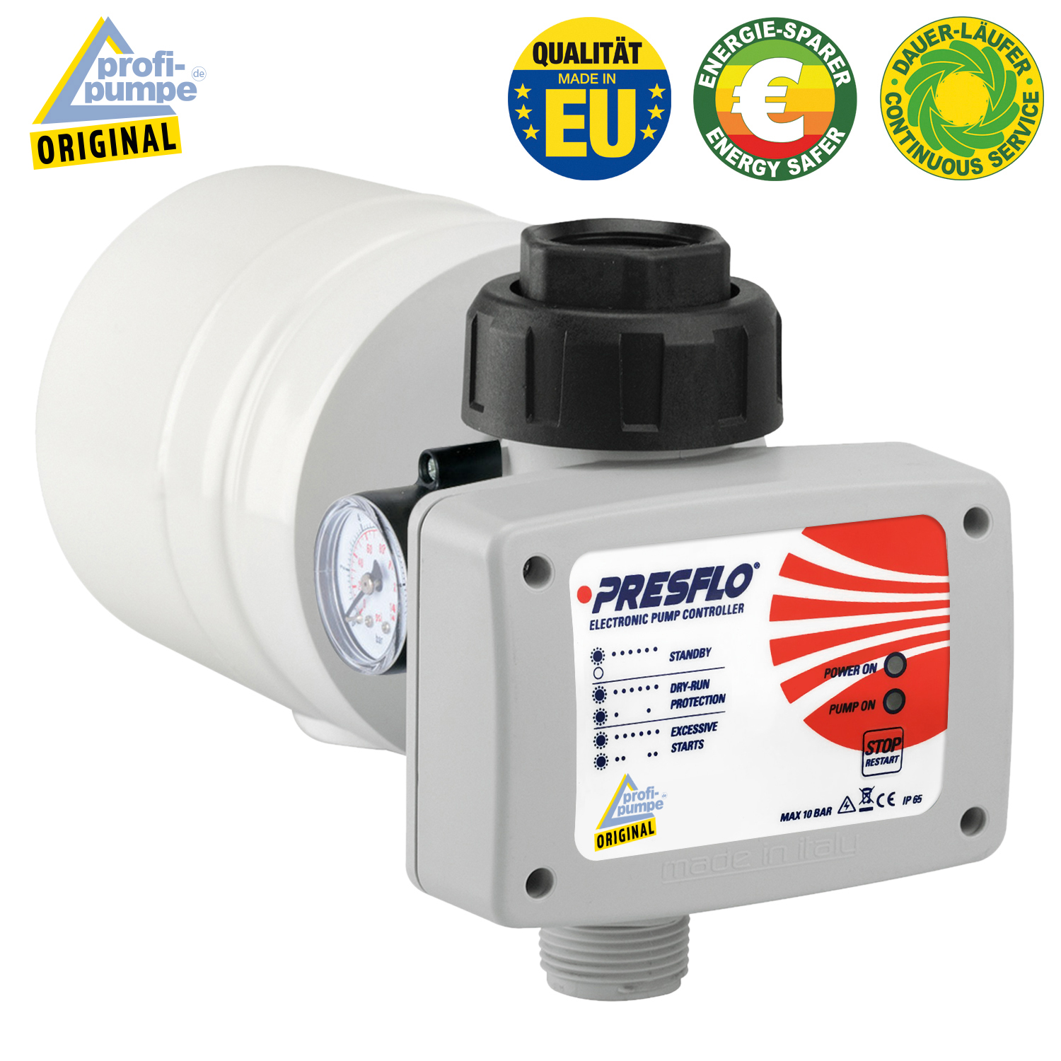 Das Besondere an dieser Pumpensteuerung PRESFLO-2-MULTI® mit integriertem Trockenlaufschutz und intelligenter Selbst-Überwachungsfunktion mit Pumpenschutz ist, dass der Betriebsdruck und der Höchststrom mechanisch eingestellt werden können; der Betriebsdruck von 1 bis 5 bar, der Stromsensor von 4 bis 16 Ampere. Die Geräte-Software überwacht die Einschaltintervalle. Bei zu häufigen “Ein-” und “Ausschaltvorgängen” in regelmäßigen Abständen wird die Pumpe nach einer fest eingestellten Zeit für eine bestimmte Pausenzeit ausgeschaltet. Nach Ablauf der Pausenzeit wird die Pumpe eingeschaltet und die Schaltvorgänge beobachtet und ausgewertet. Für viele Pumpenanwendungen ist es wichtig, daß wenn eine Störung in der Pumpe vorkommt (warum auch immer, z.b. durch Schmutzeintritt!, was manchmal unvermeidlich ist!), daß die Pumpe nicht taktet, sondern sich sicher VORHER abschaltet. Genau das macht die PRESFLO-2-MULTI®-Steuerung! Alle anderen preiswerten Schalt-Geräte haben diese Schutz-Funktion NICHT!