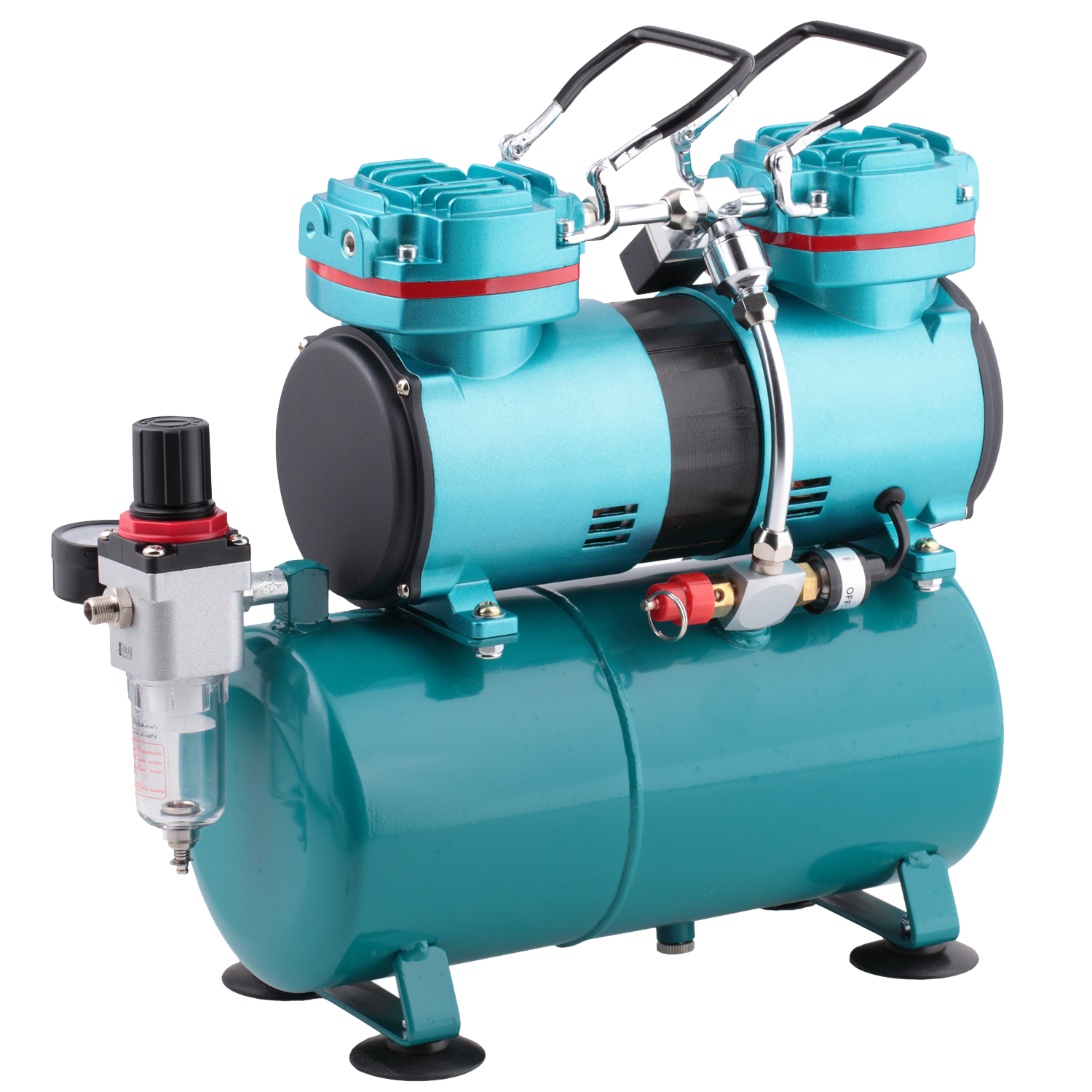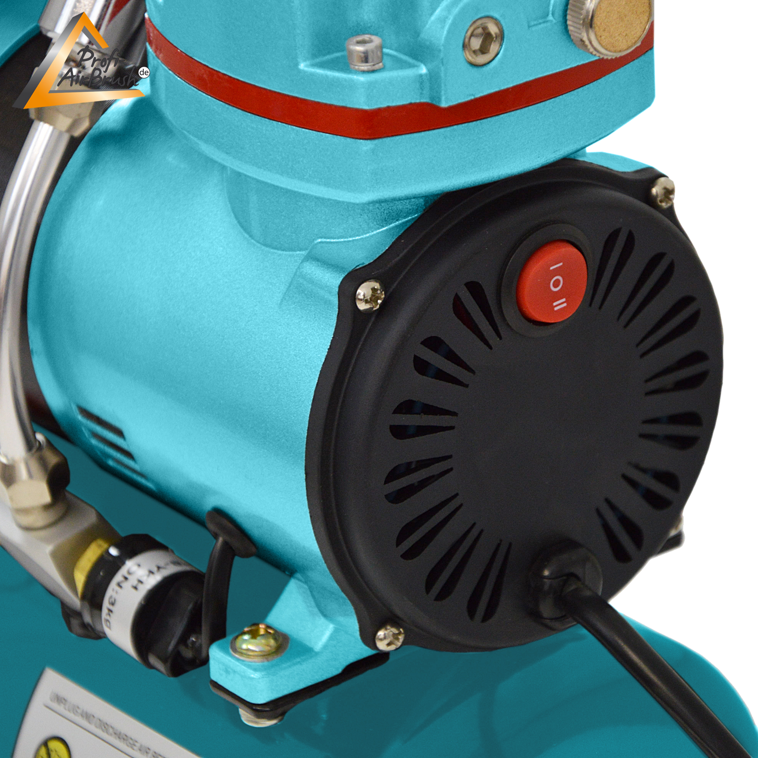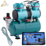 Ausgestattet ist der Airbrush Kompressor mit einem Tragegriff, einer Auto-Stop-Automatik, einem Manometer, einem Wasserabschneider, einem integrierten Durchfluss- und Druckregler und einem Luftdrucktank mit einer Druckluftreserve von 3,5 Litern.
