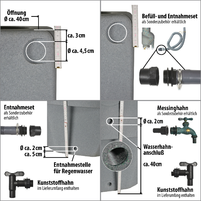 Anschlüsse an der Tonne sind angeformt aber nicht vorgebohrt, was Ihnen individuelle Aufstellmöglichkeit bietet. Die Öffnungen für Zulauf/Ablauf können beliebig an der Regentonne gebohrt werden. In 5cm über dem Tonnenboden vorgeformte Öffnung ist für Winterstopfen vorgesehen und ermöglicht eine komfortable Entleerung der Tonne im Herbst.