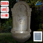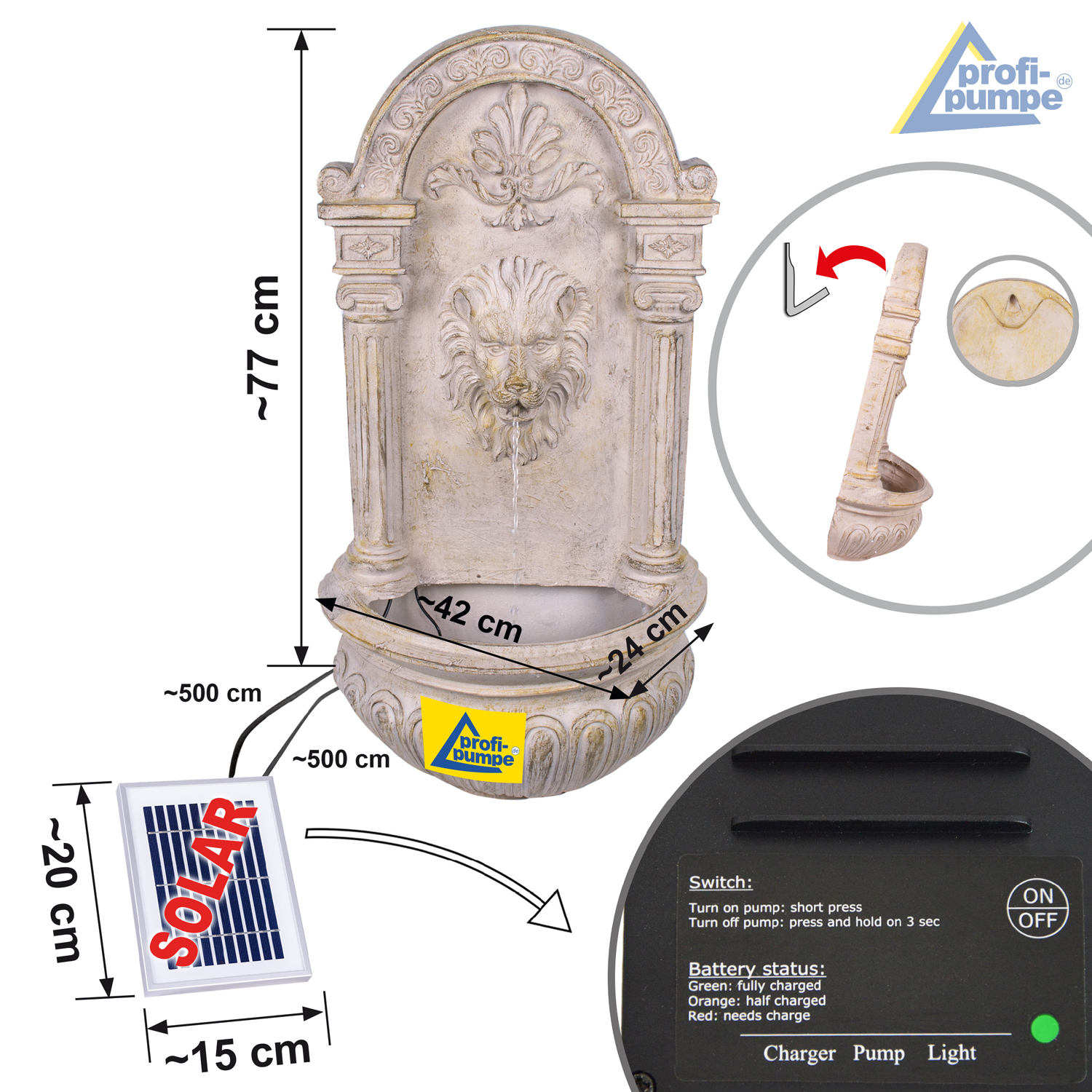The Solar garden wall fountain "LÖWEN-BRUNNEN" with Li-Ion battery and LED light ist ein Solarbrunnen für den Garten aus witterungsbeständigem Polyresin. Die Stein-Optik mit dem Kopf eines stattlichen Löwens und die Verzierungen geben dem solarbetriebenen Springbrunnen ein mondänes, barockes Aussehen und machen den Gartenbrunnen zum perfekten Blickfang. Der Solarbrunnen mit Akku setzt die Kraft der Sonne in fließendes Wasser um. Hochwertige Komponenten bringen das Wasser in Bewegung, sobald das Sonnenlicht die Solarfläche erreicht. Das beruhigende Rauschen des Wassers erzeugt im Garten, auf dem Balkon oder der Terrasse eine entspannte Atmosphäre und ist stets der perfekte Blickfang. Bei Sonneneinstrahlung fließt das Wasser aus dem Löwenmaul und wird mit der Pumpe wieder nach oben gefördert. Fließendes Wasser sorgt für noch mehr Wohlgefühl in Ihrem Garten und für ein angenehmes Mikroklima an heißen Sommertagen.