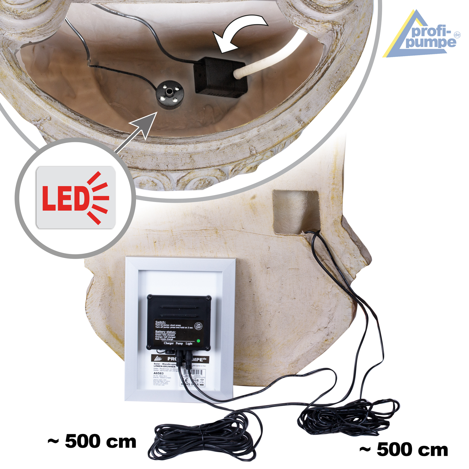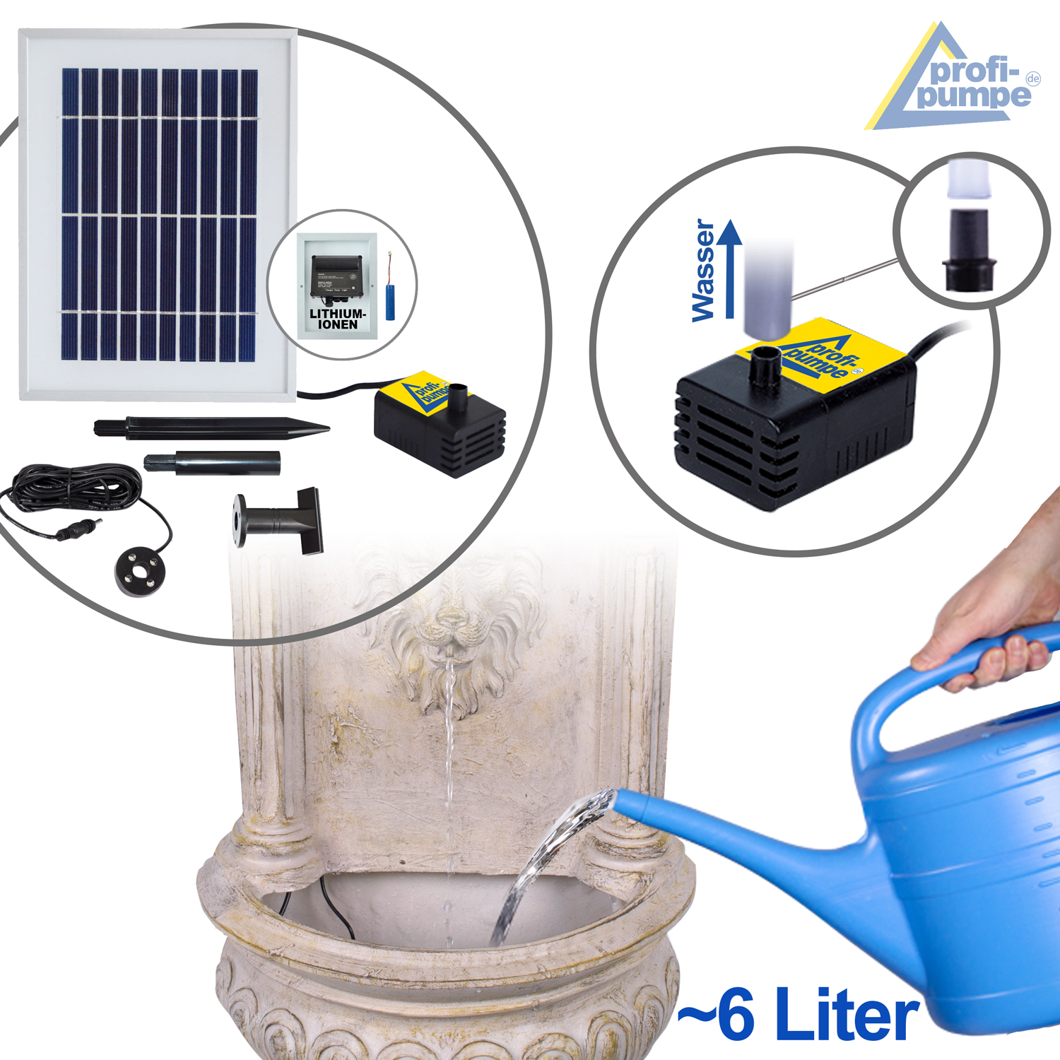 Die im Brunnen verbaute Solarpumpe, ist nicht nur für den Betrieb bei Sonneneinstrahlung ausgelegt, wie herkömmliche Solarbrunnen. Das beiliegende Solarpanel hat einen eingebauten Akku. Dieser Akku lädt sich bei Sonneneinstrahlung auf und kann so den Betrieb des Solar-Wasserspiels auch nach Sonnenuntergang oder bei ungünstigeren Lichtverhältnissen aufrechterhalten. Die maximale Förderleistung wird bei optimalen Bedingungen erreicht. Die Pumpe schaltet sich am nächsten Tag automatisch in den Solarmodus, wenn die Sonne scheint. Der Akku kann auch ausgeschaltet werden.