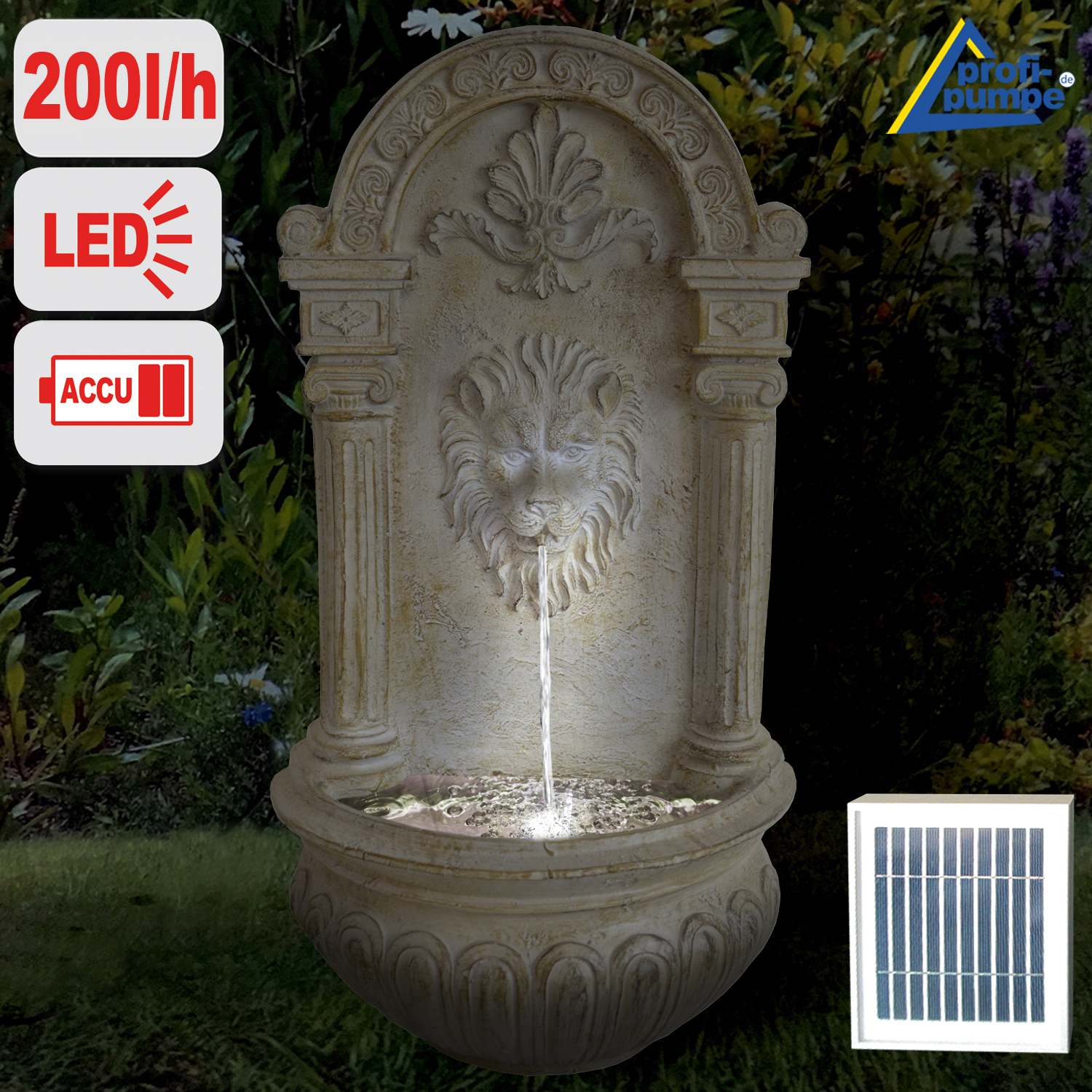 Solar garden wall fountain "LÖWEN-BRUNNEN" with Li-Ion battery and LED light