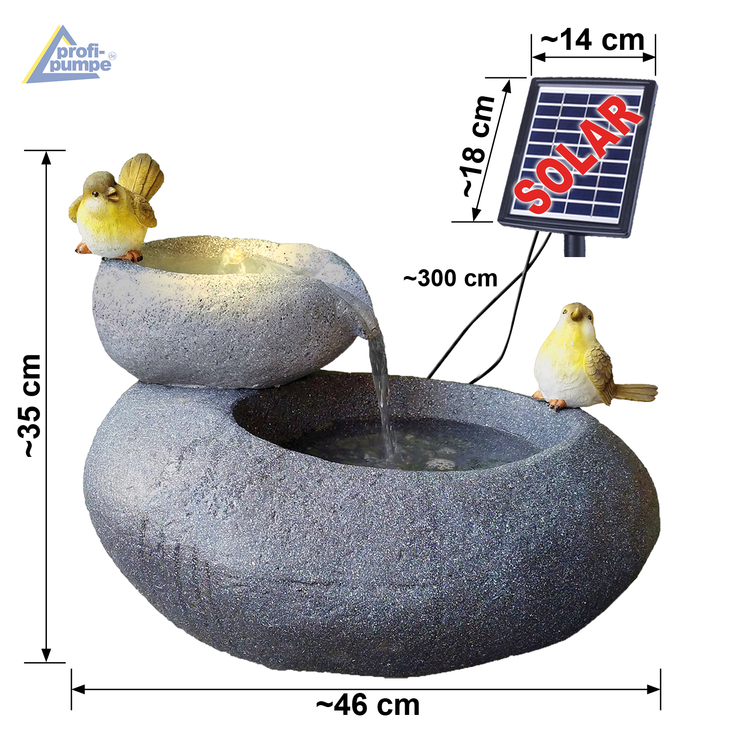 Mit den “FELS-SCHALEN” sorgen Sie für einen Blickfang in Ihrem Garten. Die kleinen Vögel auf den Fels-Schalen machen diesen Gartenbrunnen unverwechselbar. Das funkelnde Wasser im Sonnenlicht und das beruhigende Plätschern lässt eine Wohlfühlatmosphäre entstehen. Je stärker das Sonnenlicht ist, desto intensiver ist das Wasserspiel! An heißen Sommertagen sorgt der Solar-Brunnen für ein angenehmes Mikroklima.