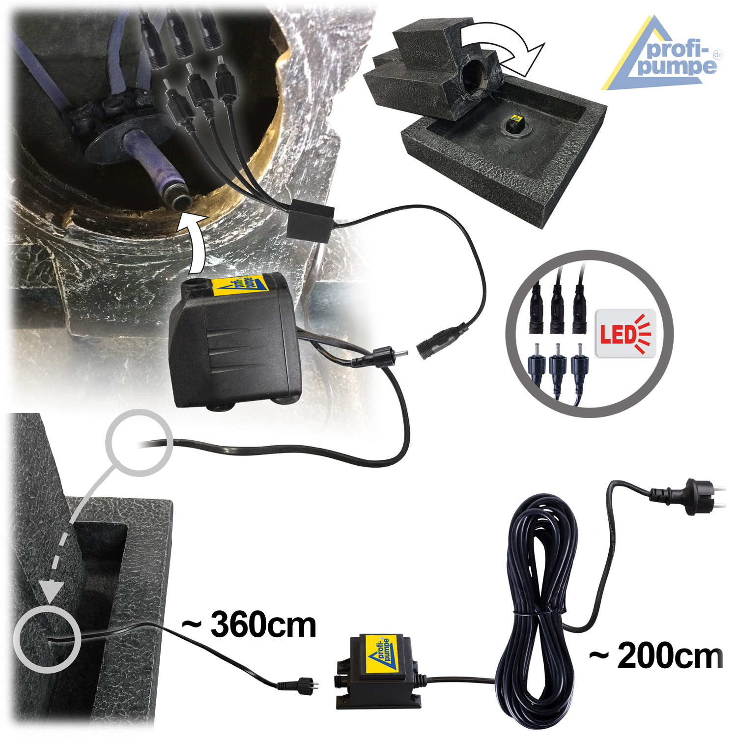 Der rustikale Zierbrunnen TRIO-BASALT ist für den 230-Volt-Betrieb vorgesehen. Die Pumpe und die LEDs werden mit sicherer 12V-Niederspannung betrieben (Adapter im Lieferumfang enthalten). Alle Kabelverbindungen sind verpolungssicher, wasserdicht, absolut funktionssicher. Dank praktischer Steckverbindungen sind alle Komponenten jederzeit austauschbar. So können Sie den Wasserbrunnen TRIO-BASALT und das fließende Wasser jahrelang genießen!