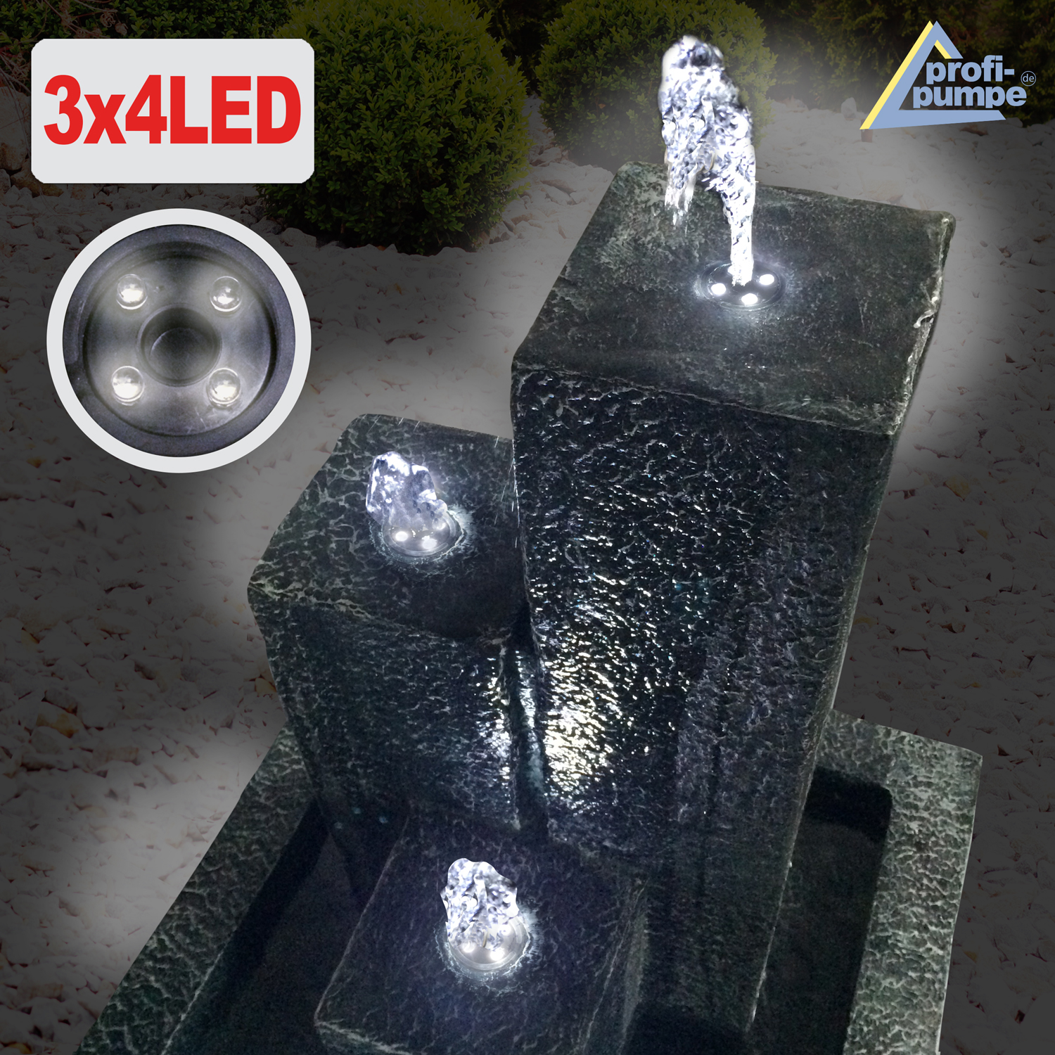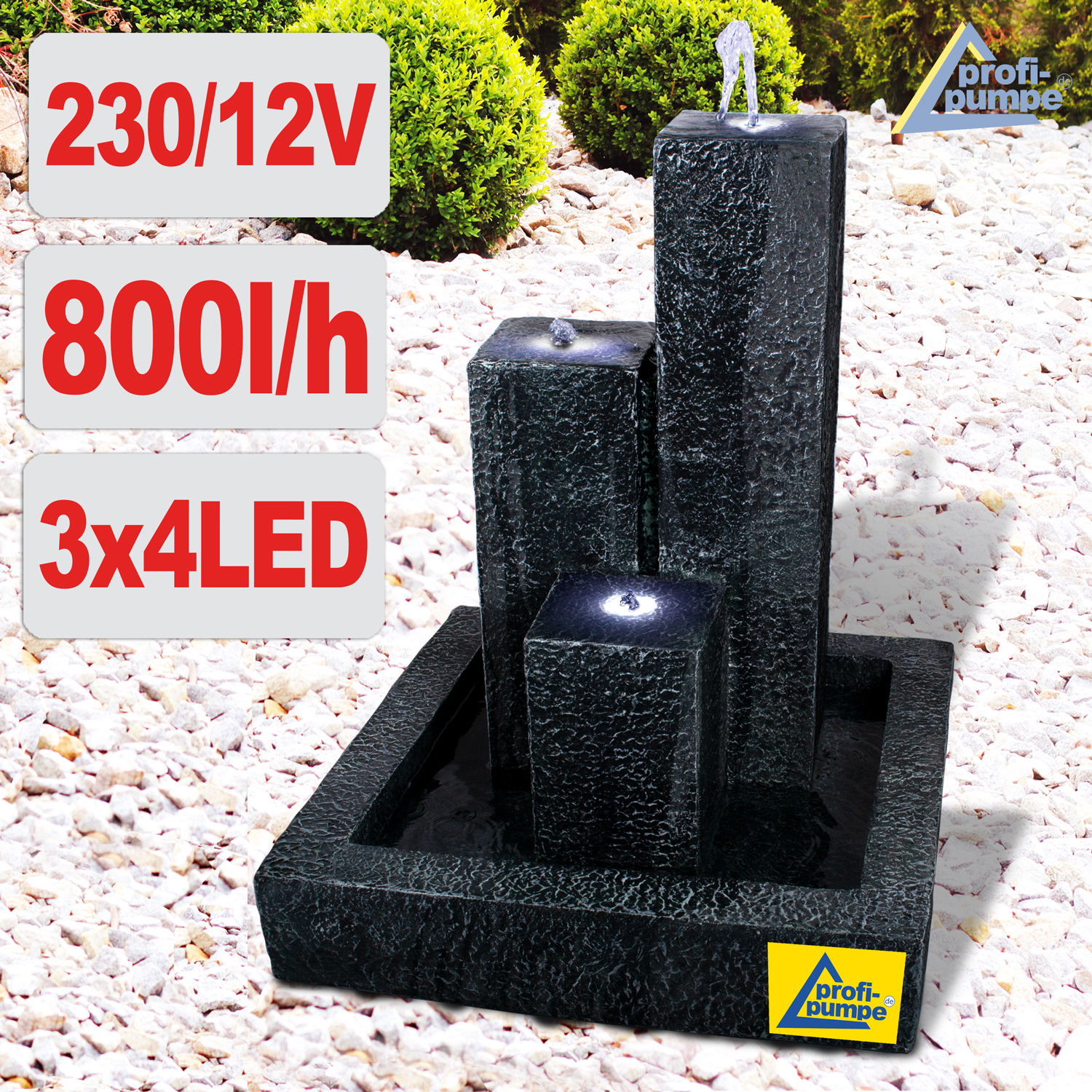 En B-Ware Gartenbrunnen TRIO-BASALT mit LED-Licht ist für den Innen- und Außenbereich geeignet. Betrieben wird der Garten- und Zimmerbrunnen mit einem 230/12-Volt Netzadapter. Der moderne Brunnen zaubert mit seiner Eleganz eine tolle Atmosphäre. Das Lebenselixier Wasser belebt Wohnzimmer, Esszimmer, Flure und Eingangsbereiche, Wintergärten oder Balkone, Terrassen und Gärten im privaten wie gewerblichen Umfeld.