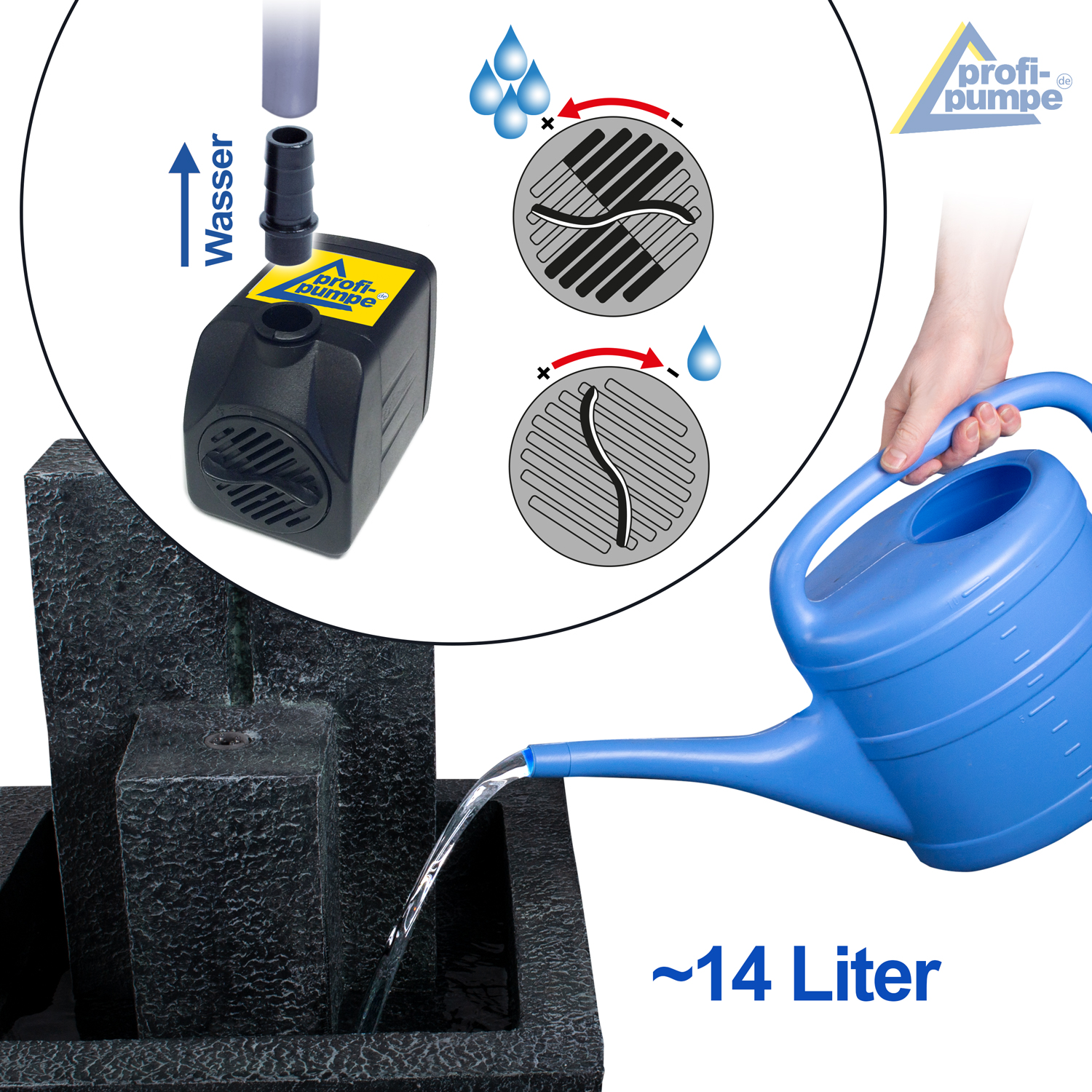 Nota: Frost kann zu Schäden am Gartenbrunnen und der Pumpe führen. Bei Frostgefahr muss der Gartenbrunnen und die Pumpe entleert werden, mit klarem Wasser gespült und trocken eingelagert werden. Dann haben Sie sehr lange Freude daran!