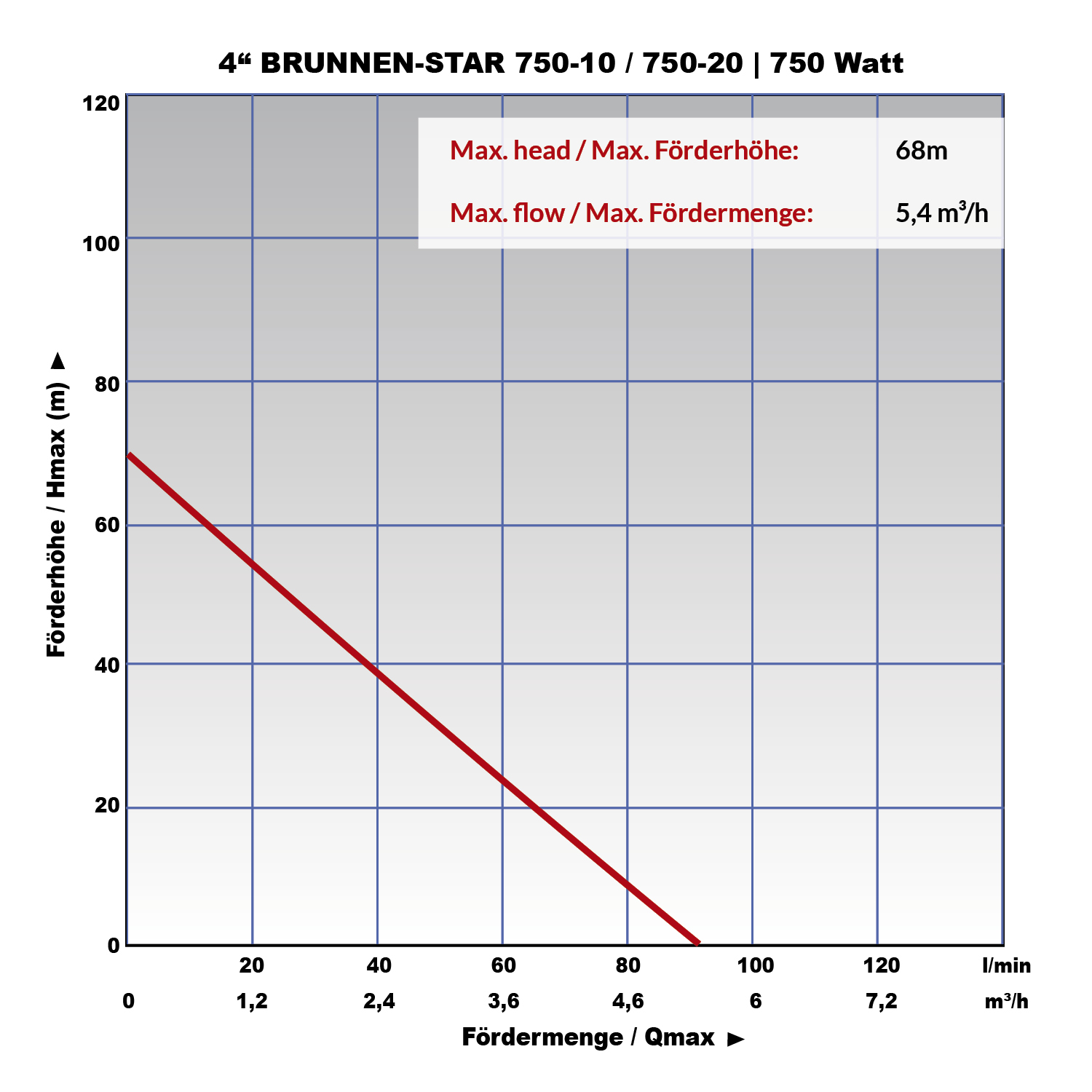 Diese BRUNNEN-STAR-AUTOMATIC 750-20 ohne SAND-VORFILTER erbringt eine Leistung von P2 750 Watt, P1 1500 Watt. Die maximale Förderhöhe beträgt 68m,