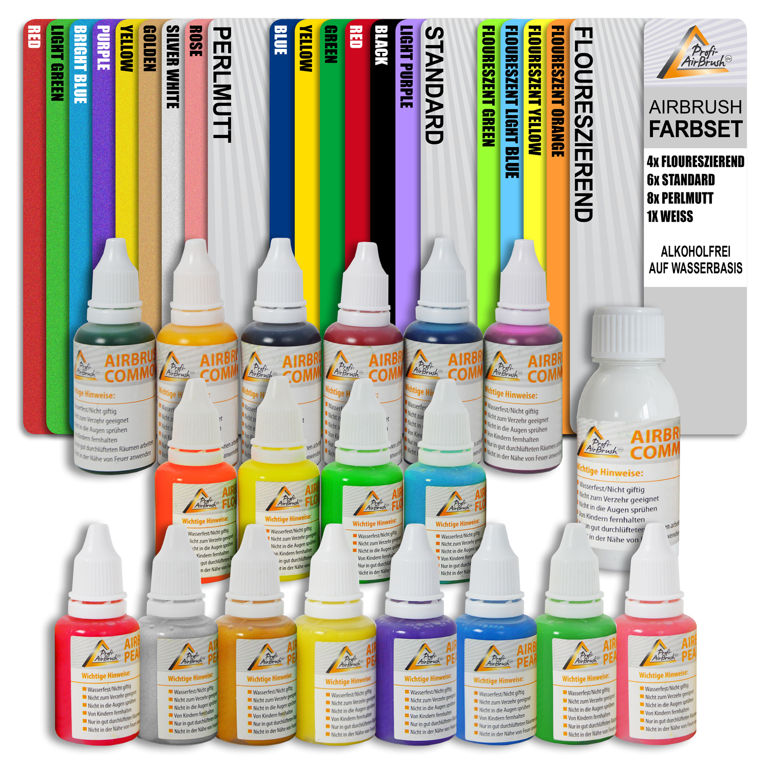 AIRBRUSH FARBEN 19-er Set in Geschenkverpackung auf Wasserbasis- Grundausstattung für jedes Airbrush-Set, universal einsetzbar, für Profis als auch für Einsteiger geeignet, ideal für Airbrush Tattoos, Body Painting, Körperbemalung etc. ergiebige, leuchtstarke Farben. Keine Fertigfarbe, durch Verdünnen sehr ergiebig!