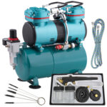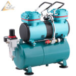 Ausgestattet ist der Airbrush Kompressor mit einem Tragegriff, einer Auto-Stop-Automatik, einem Manometer, einem Wasserabschneider, einem integrierten Durchfluss- und Druckregler und einem Luftdrucktank mit einer Druckluftreserve von 3,5 Litern.