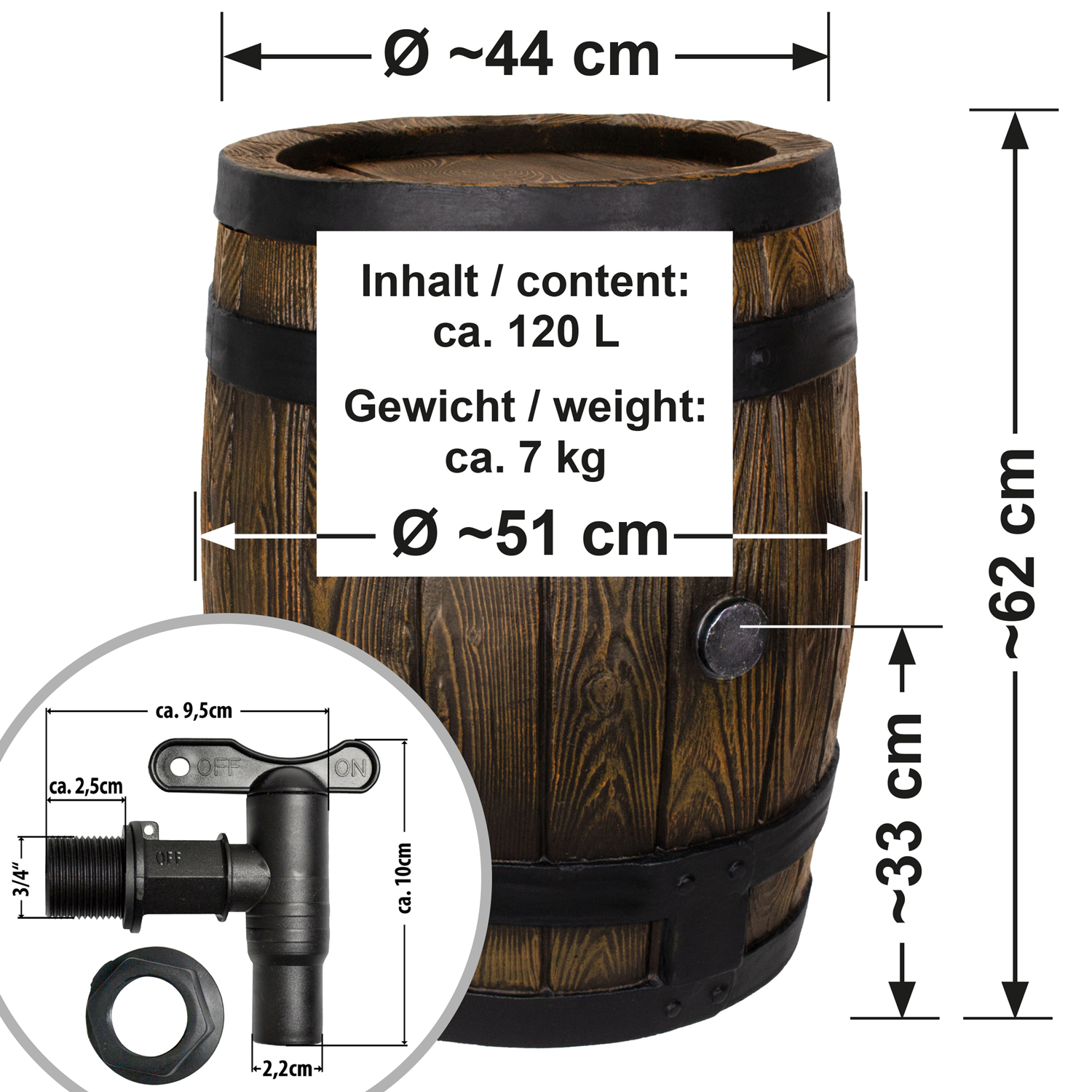 Im Lieferumfang dieser hochwertigen Regentonne im formschönen Design sind ein Deckel und ein Auslauf-Hahn enthalten. Beim Verschluss des Regentonnen-Deckels handelt es sich um einen kindersichereren Bajonett-Verschluss. Diesen speziellen Verschluss finden sie bei unseren Modellen Regentonne Eichenfass, Regentonne Baum und Regentonne Fels. Der Auslaufhahn für Regentonnen in schwarz aus PE-Kunststoff hat einen 3/4-Zoll-Anschluss. Er kann optimal an den dezent vorgeformten Stellen am Regenfass für den Wasser-Zu- und Ablauf angebracht werden.