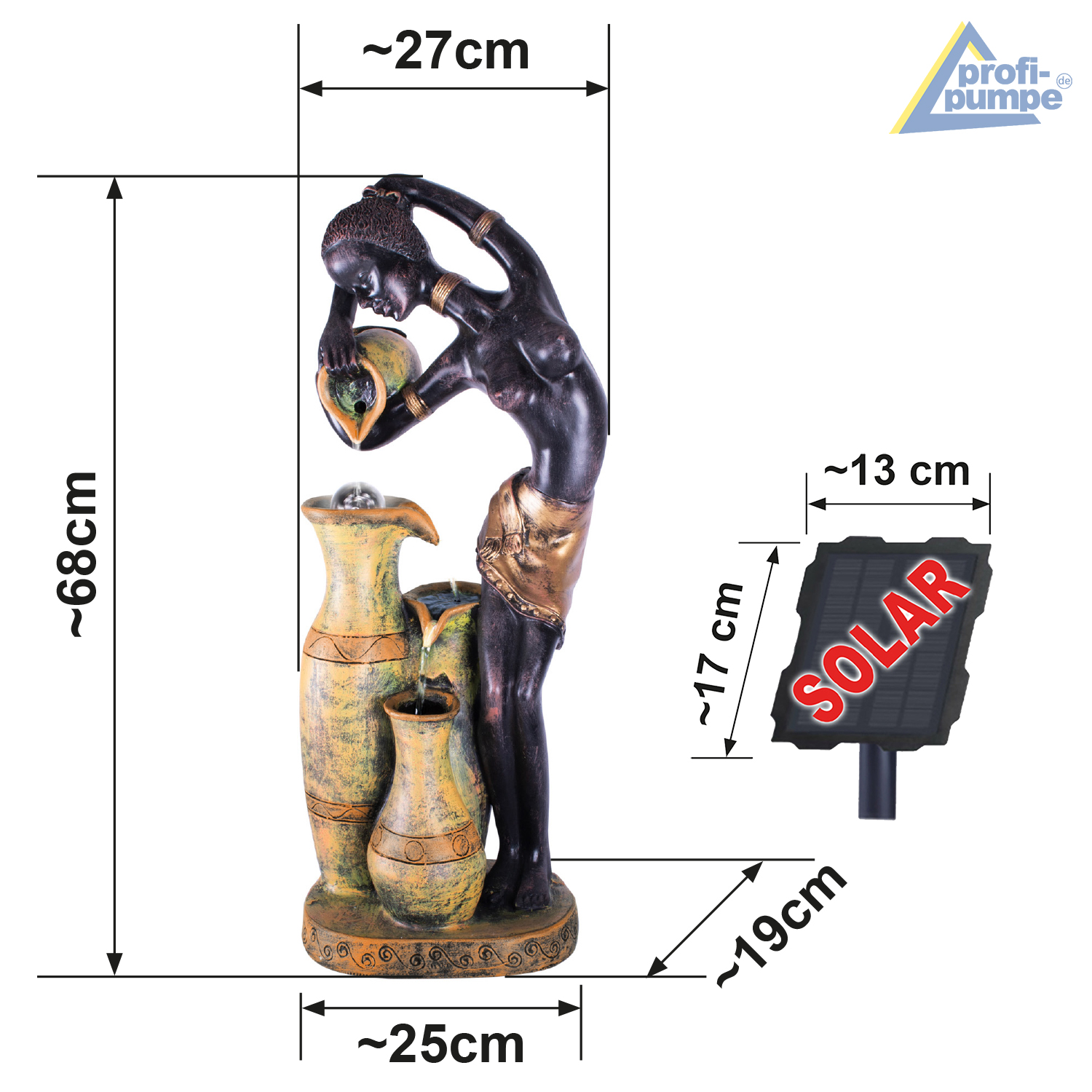En Solar-Gartenbrunnen “NAOMI” im Stil afrikanischer Kunst zaubert auch bei Ihnen eine tolle Atmosphäre. Durch das im Set vorhandene Solarpanel wird die Kraft der Sonne in fließendes Wasser umgesetzt. Die hochwertigen Komponenten des Solarbrunnens bringen das Wasser in Bewegung, sobald das Sonnenlicht die Solarfläche erreicht. Je stärker die Sonne, umso intensiver wird das Wasserspiel! Das beruhigende Rauschen des Wassers gibt jedem Garten eine besondere Note und das im Sonnenlicht funkelnde Wasser ist stets der perfekte Blickfang. Das fließende Wasser sorgt für noch mehr Wohlgefühl in Ihrem Garten und für ein angenehmes Mikroklima an heißen Sommertagen.