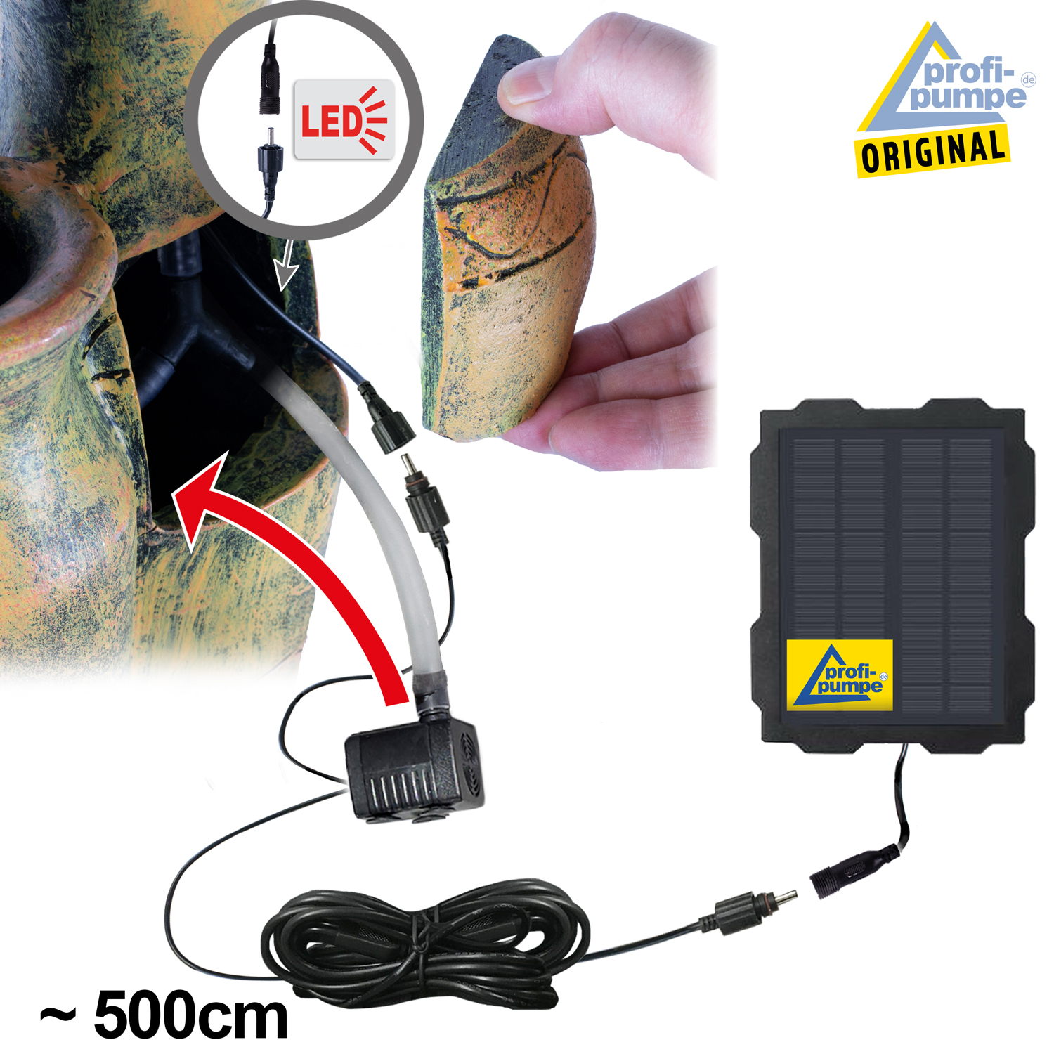 Platzieren Sie diesen Solarbrunnen einfach an einer beliebigen Stelle in Ihrem Garten. Durch das einfache Steckprinzip und dem Solarpanel ist er schnell aufgebaut. Ein weiterer Vorteil ist, dass Sie an keine Steckdose gebunden sind und das lästige Verlegen des 230V-Kabels entfällt. Kein Ärger mehr mit den durch Nagetiere beschädigten Kabeln und dadurch verursachten Stromausfällen. Außerdem können Sie das Solarsystem nach Ihrem Geschmack effektvoll positionieren. Der Gebrauch des Solarpanels ist auch die sichere Alternative zu der 230V Steckdose. Bitte bedenken Sie, dass das Solarpanel stets im vollen Sonnenlicht zu platzieren und auszurichten ist, da sonst keine Pumpenfunktion garantiert werden kann.
