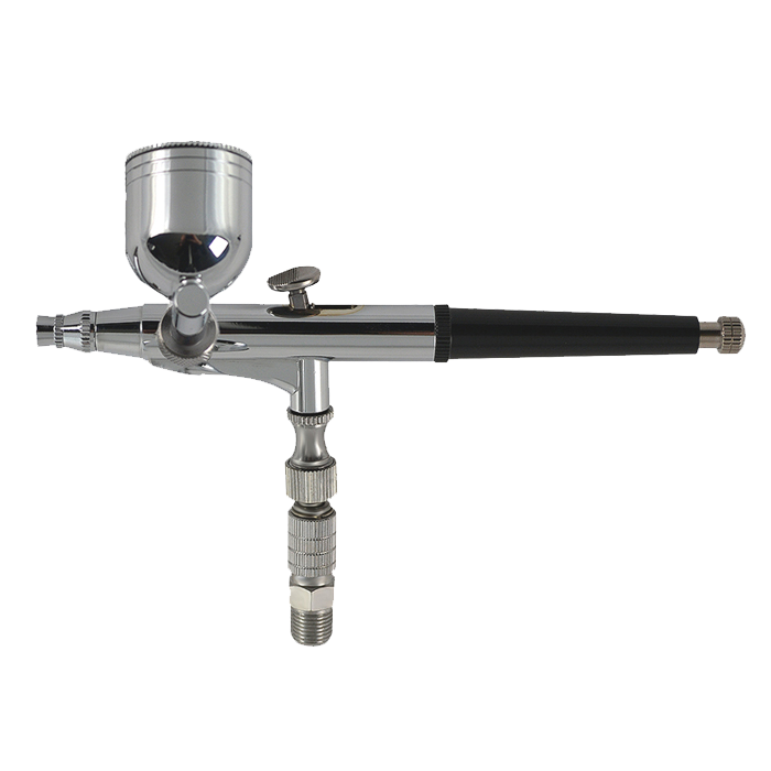 Ausgestattet mit 0,2mm / 0,3mm / 0,5mm NADEL/DÜSE Kombination und 2 verschiedenen Farbbehältern (7ml und 22ml) ist die Airbrush-Pistole “Double-Action-Gun 134s” besonders für den Beginner zum Kennenlernen der einzelnen Techniken und für ein zügiges Arbeiten optimal geeignet. Damit lassen sich sowohl feine Linien ziehen, als auch größere Flächen airbrushen. Für größere Farbmengen wird der 22ml-Glasbehälter und für kleinere Farbmengen der 7ml Metallaufsatz verwendet.