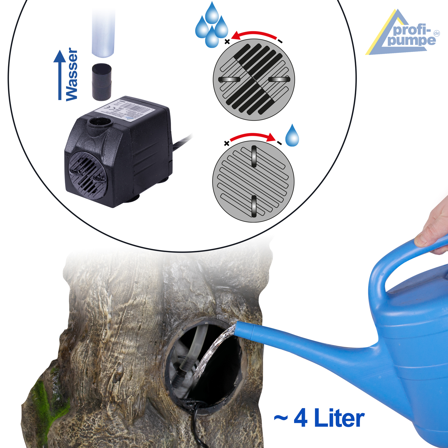 • Mit 230V/12V-Anschluss, 7 Watt Pumpe und LED-Ringe in warmem Weiß